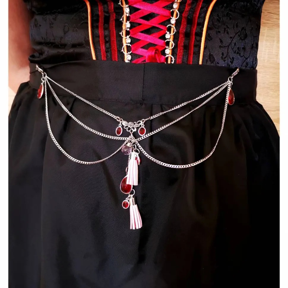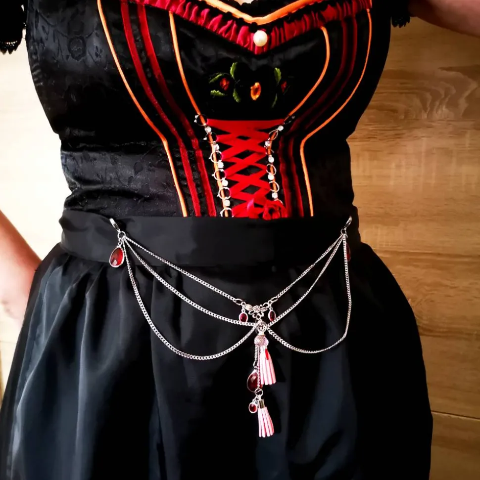 Unsere Charivaris sind meist für Schürzen (siehe Länge) gedacht. Dank großer, stabiler Edelstahlkarabiner läßt sich das Charivari problemlos einhängen und kann jederzeit gewechselt werden.