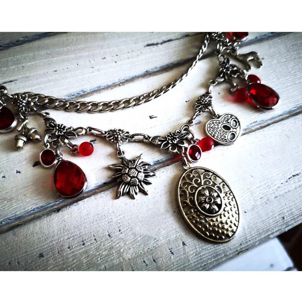 Dieses Charivari kann Schürzen und Mieder (siehe Länge) verzieren. Dank großer, stabiler, verzierter Karabiner läßt sich das Charivari problemlos einhängen und kann jederzeit gewechselt werden.