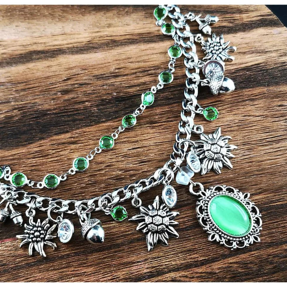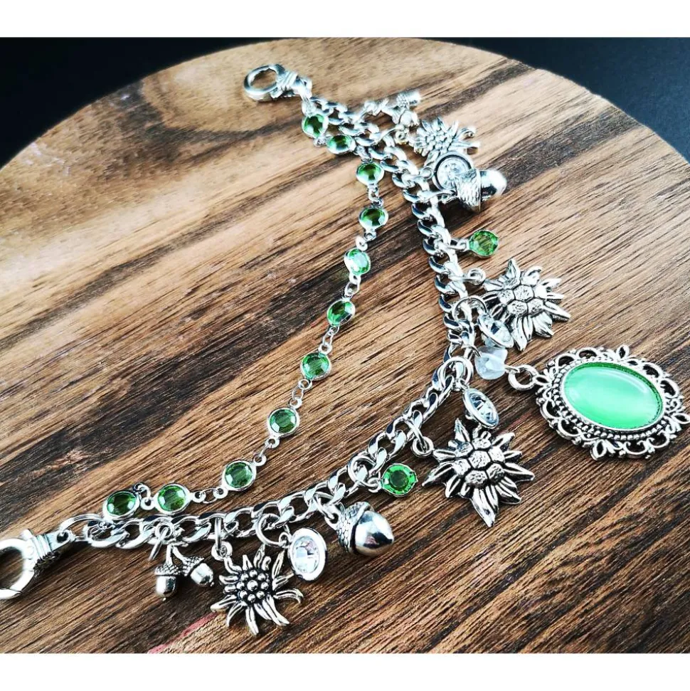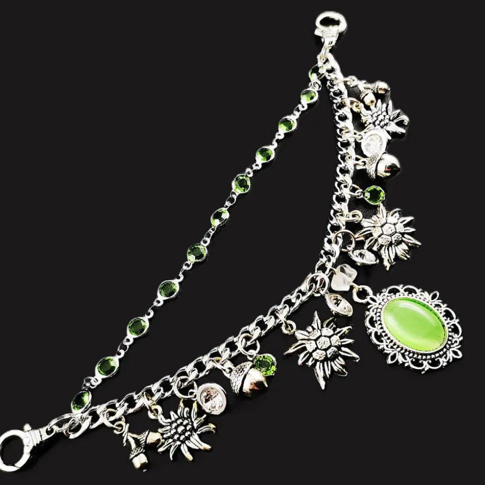Dieses Charivari kann Schürzen und Mieder (siehe Länge) verzieren. Dank großer, stabiler, verzierter Karabiner läßt sich das Charivari problemlos einhängen und kann jederzeit gewechselt werden.
