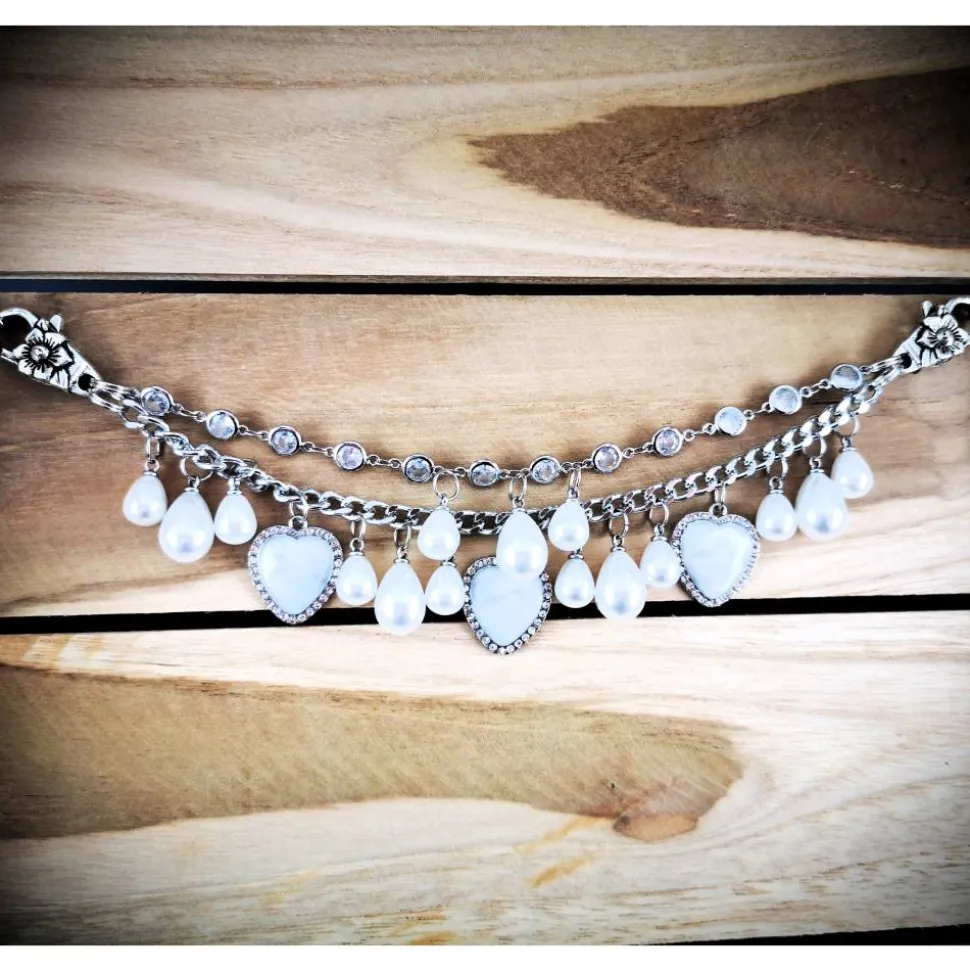 Die emaillierten Herzen mit funkelnden Strasssteinen und die weißen Tropfenperlen verleihen diesem Schmuckset eine elegante Note.