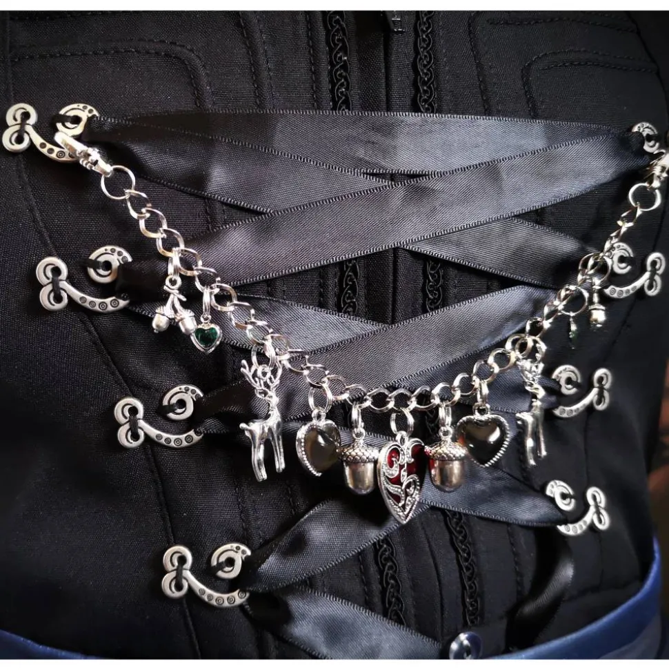 Das Charivari ist ca. 22 cm lang und kann auf vielfältige Weise am Dirndl befestigt werden.