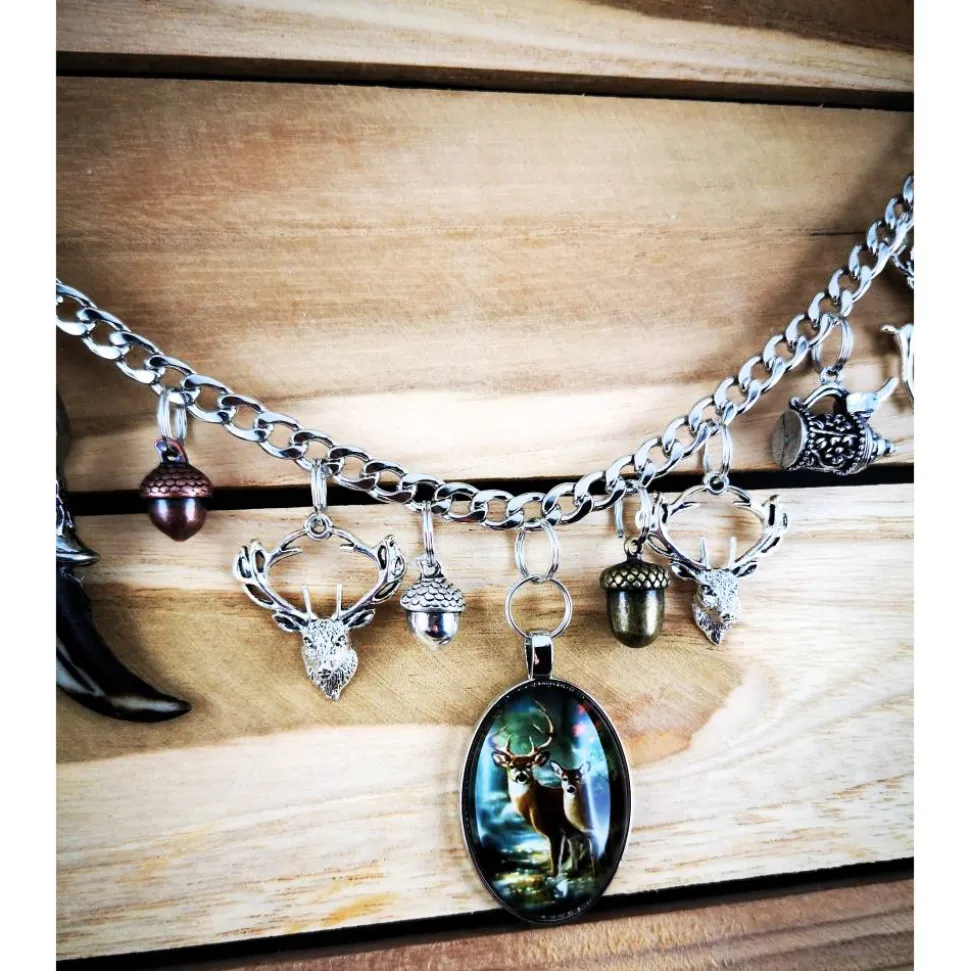 An der robusten Panzerkette aus Metall sind verschiedene Anhänger befestigt, darunter ein Glasanhänger mit Hirsch und Reh, kunstvoll gestalteter Stoßzahn, ein liebevoll gestalteter Bierhumpen mit beweglichem Deckel und das Bayernwappen aus Harz.