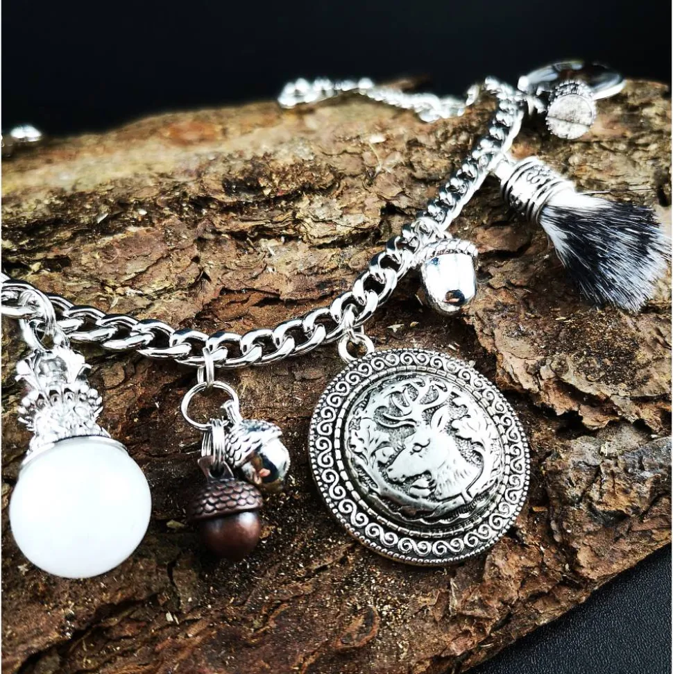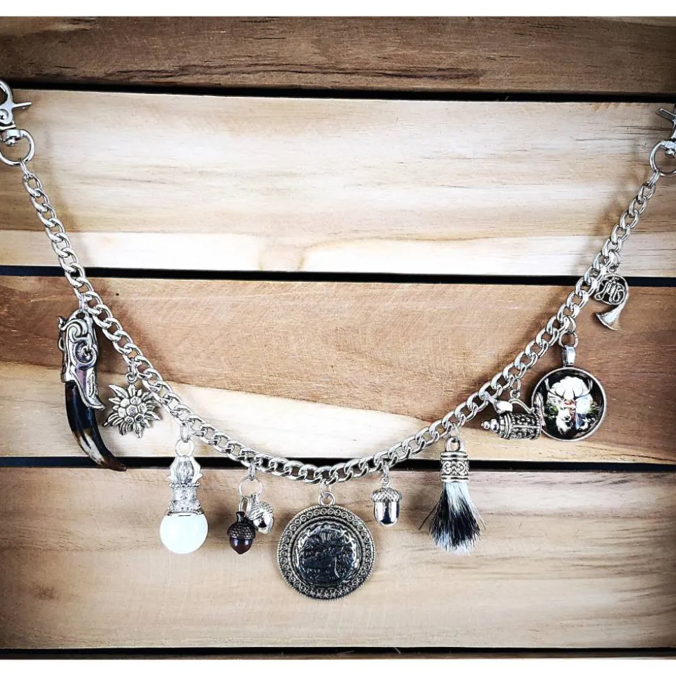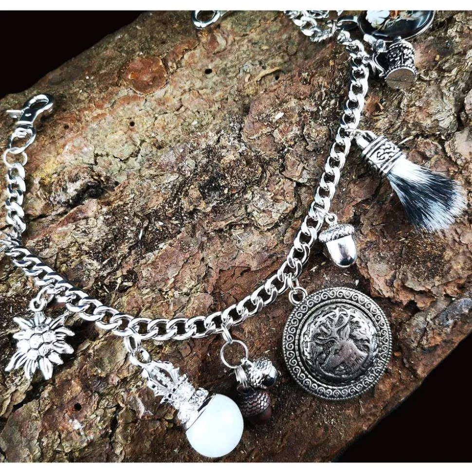 Besonders hervorzuheben ist der detailverliebte Hirschkopfanhänger aus Metall, der Wildbartanhänger (die Harre sind künstlich) sowie der kunstvoll gestaltete und verzierte Stoßzahn. Der liebevoll gestaltete Bierhumpen mit beweglichem Deckel sowie der verzierte Quarzanhänger ergänzen das Gesamtbild perfekt.