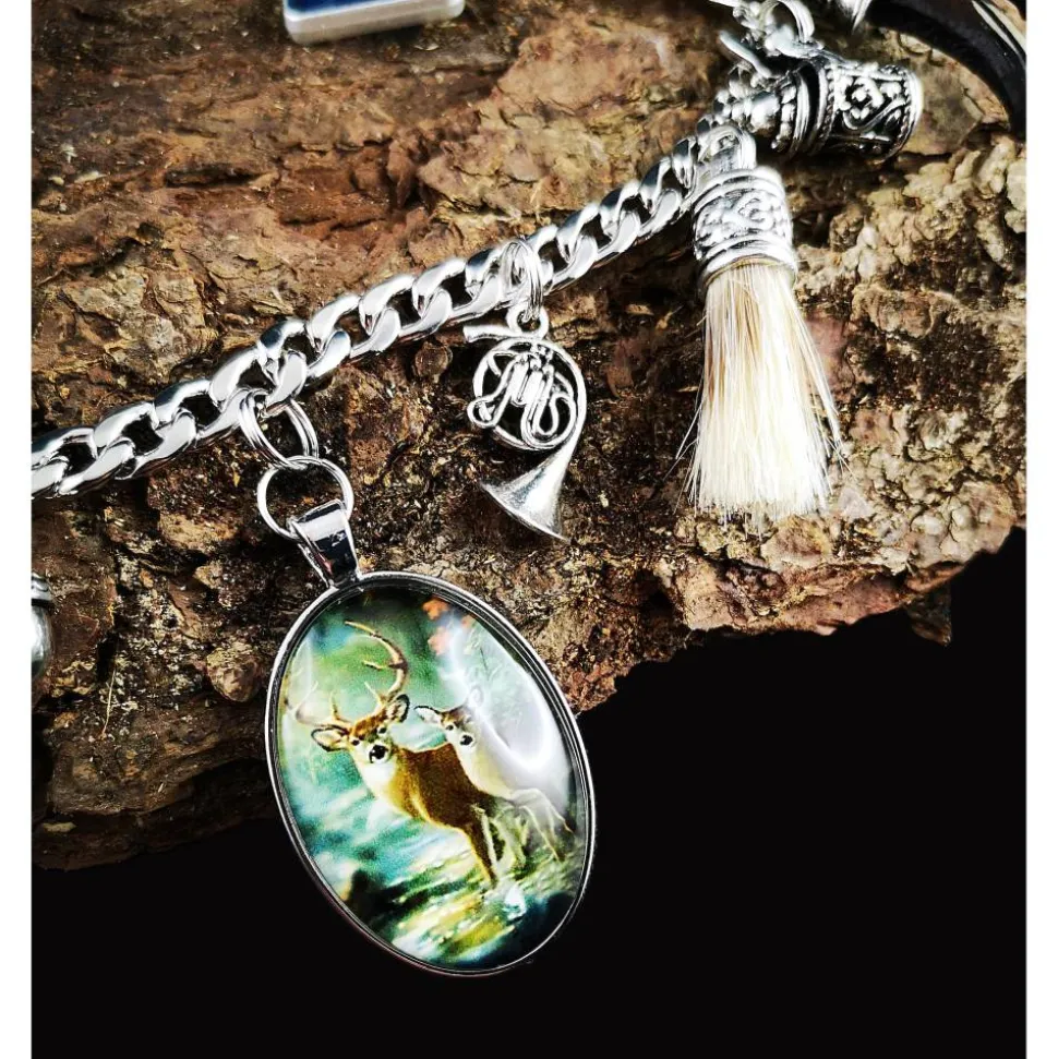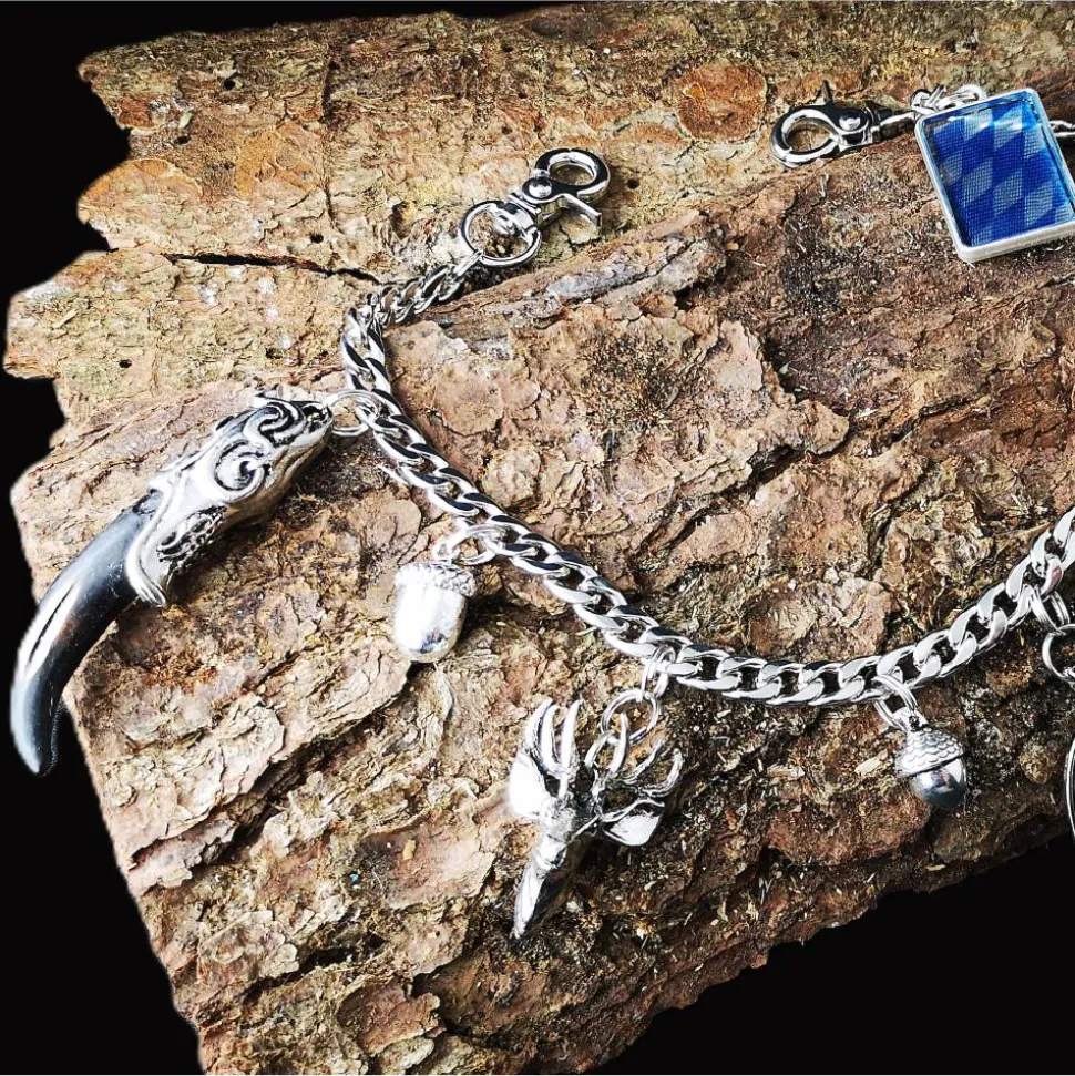 Besonders hervorzuheben ist der detailverliebte Hirschkopfanhänger aus Metall, der Wildbartanhänger (die Harre sind künstlich) sowie die kunstvoll gestalteten und verzierten Stoßzähne aus Harz. Der liebevoll gestaltete Bierhumpen mit beweglichem Deckel, der Glasanhänger mit Wildpaar sowie der Bayernanhänger aus Harz ergänzen das Gesamtbild perfekt.