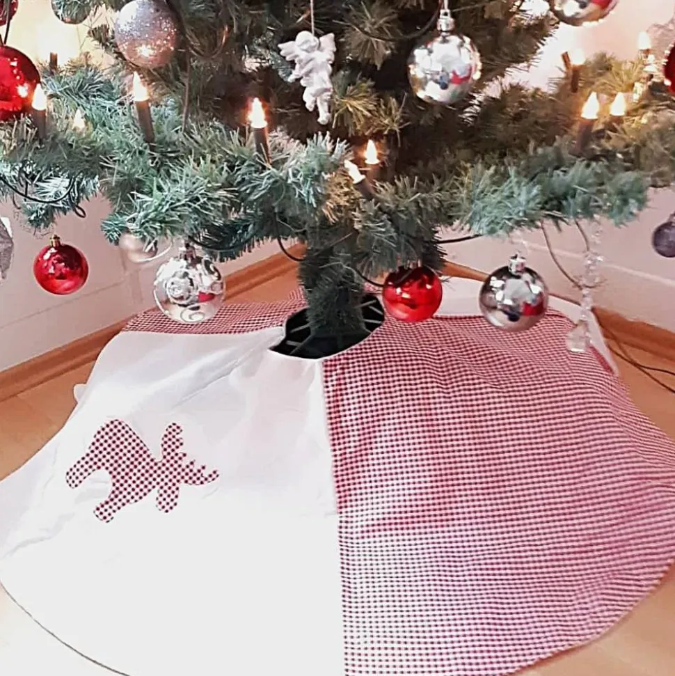 Die Christbaumdecke ist an einer Stelle durch Druckknöpfe zu öffnen, damit man sie leicht um den Baum legen kann. Die untere Seite der Baumdecke besteht aus Fleece, wodurch sie etwas schwerer und weicher ist. Somit fällt die Baumdecke schön und macht zu gleich eine kuschlig-warme Ambiente.