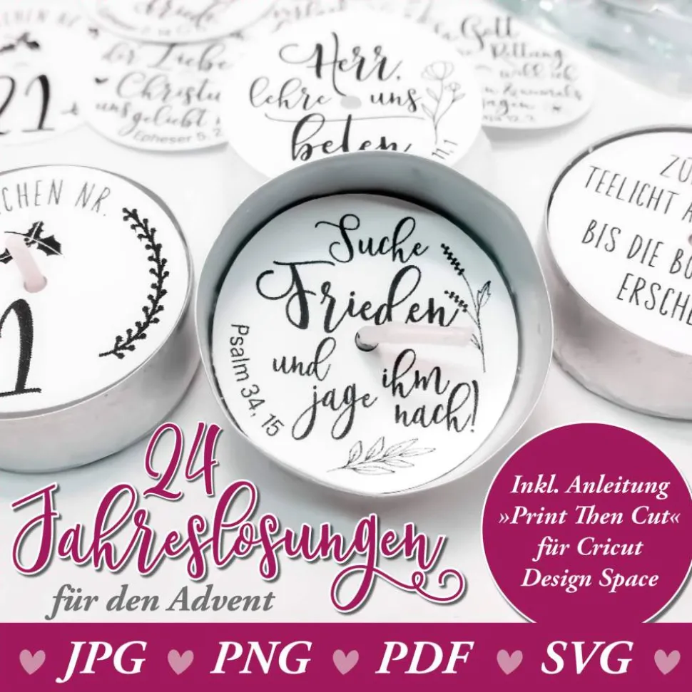 – 24 hochauflösende Dateien für Teelicht-Botschaften mit liebevoll ausgewählten Jahreslosungen (DIN A4).