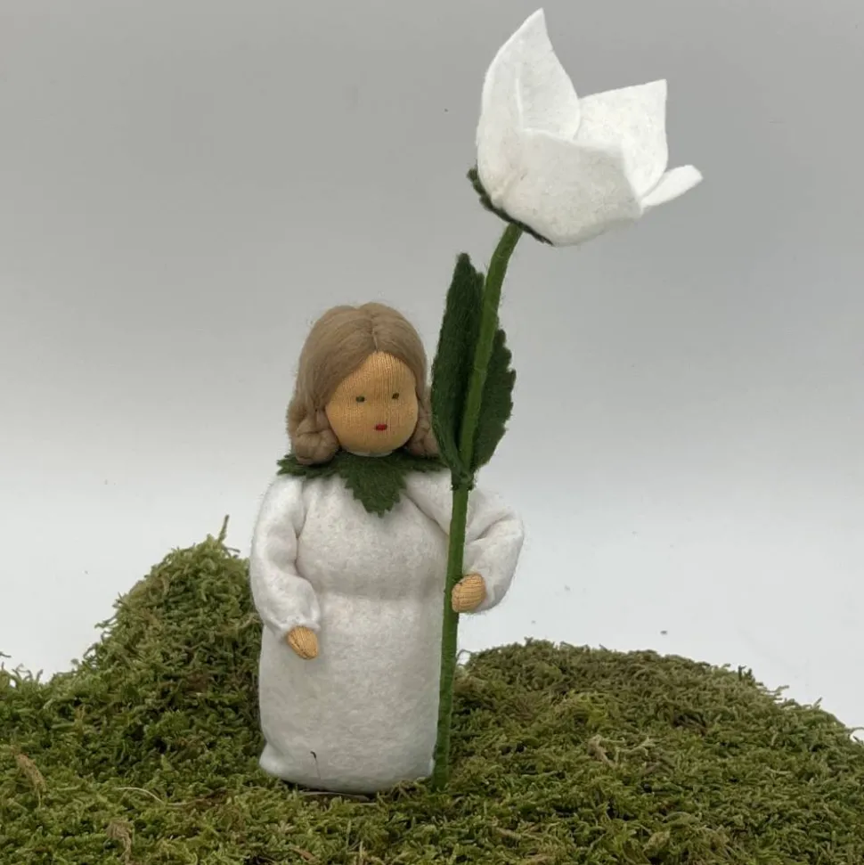Das Püppchen ist unten geschlossen und für einen guten Stand unten mit feinem Dekokies und der Rest mit reiner Schurwolle gefüllt.