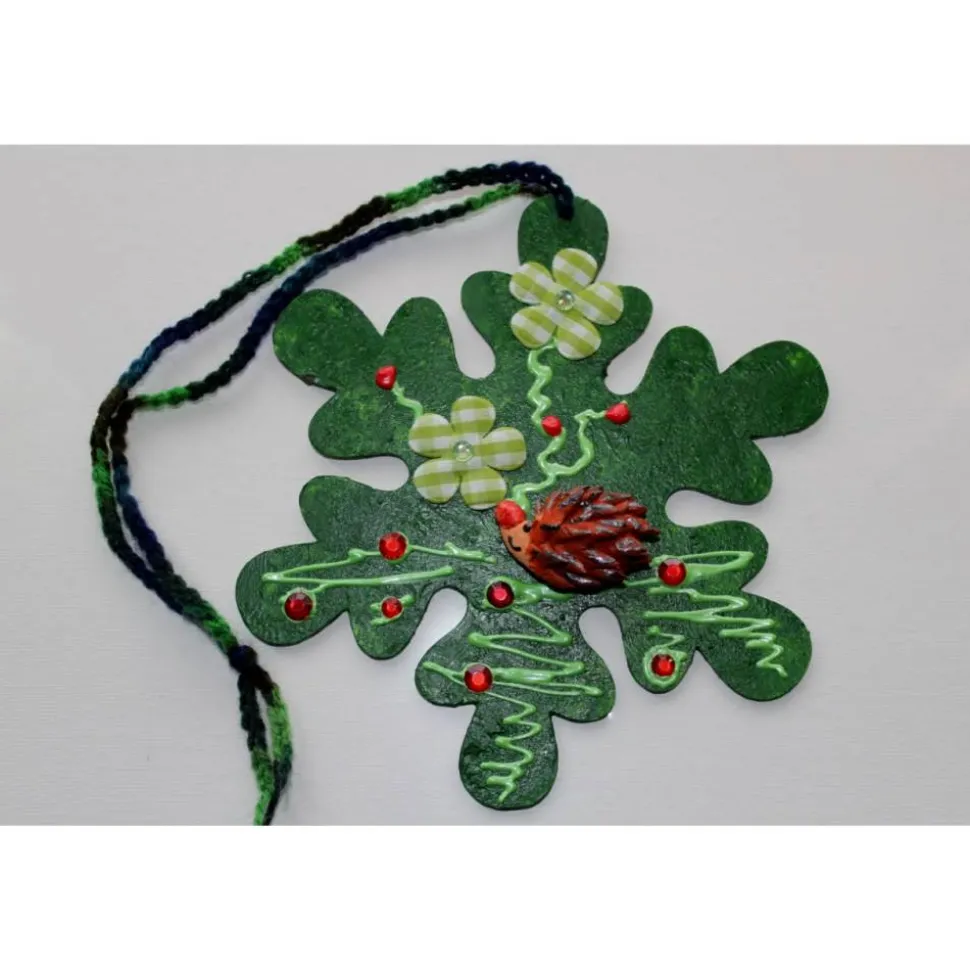 Bemalt mit Acrylfarben, dekoriert mit einem handmodelierten Ton-Igelchen, Stoffblümchen und Glitzersteinchen.