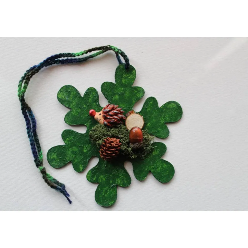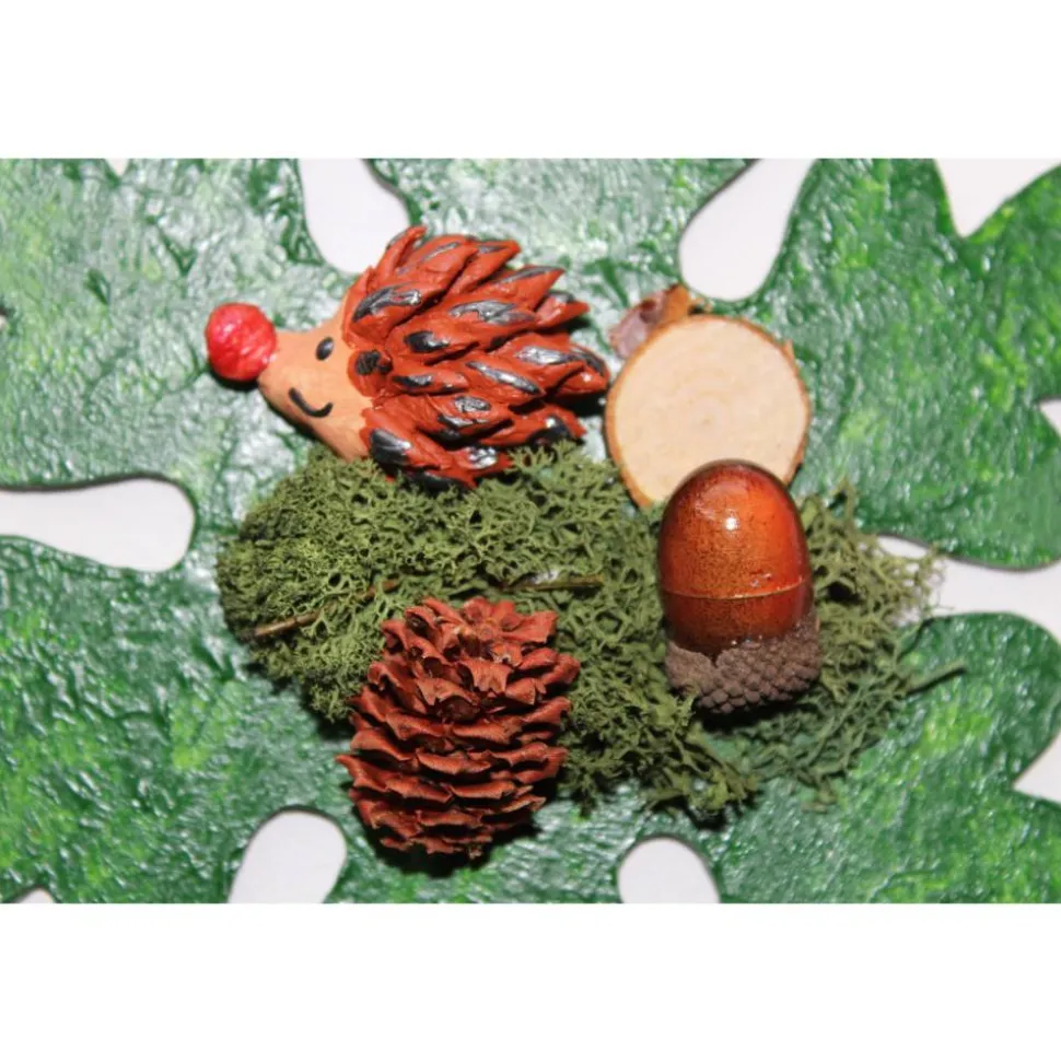 Bemalt mit Acrylfarben, dekoriert mit einem handmodelierten Ton-Igelchen, Zapfen, Moos, Holz und einer Eichel aus Kunststoff.