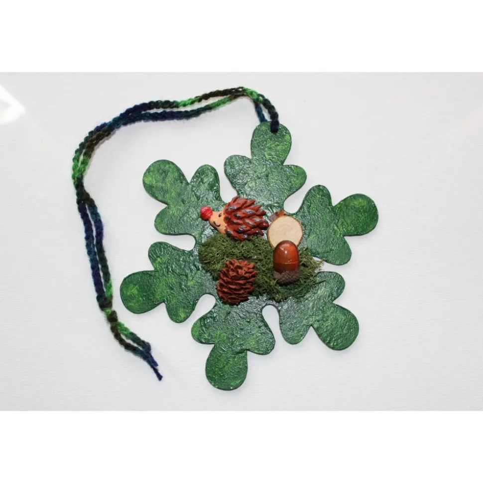 Verwendetes Material: Holz, Acrylfarbe, Zapfen, Moos, Kunststoff, Stoff, Firnis (Schlusslack).