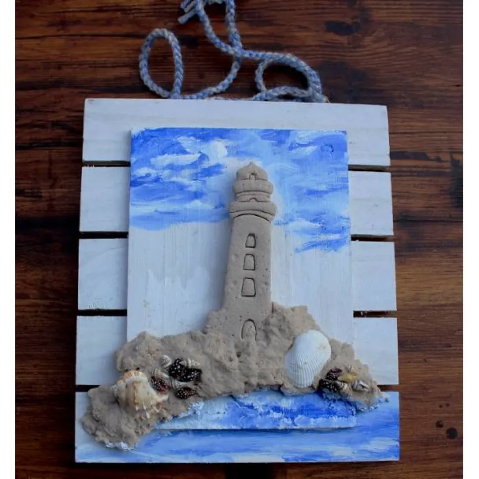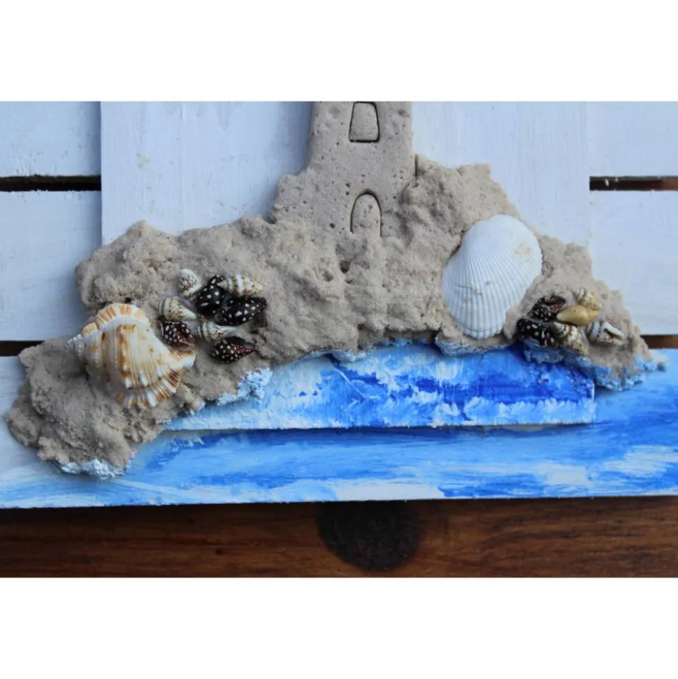 Auf Holz gestaltete Collage im Shabby-Stil. Aus Sand und Muscheln gestaltet, mit Acrylfarben bemalt.