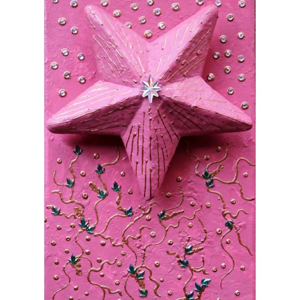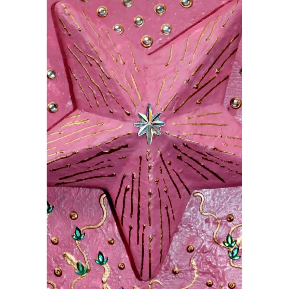 Der Stern ist auf einem Keilrahmen befestigt und mit unzähligen Glitzersteinen dekoriert. Die Verzierungen sind mit Acrylfarben gestaltet.