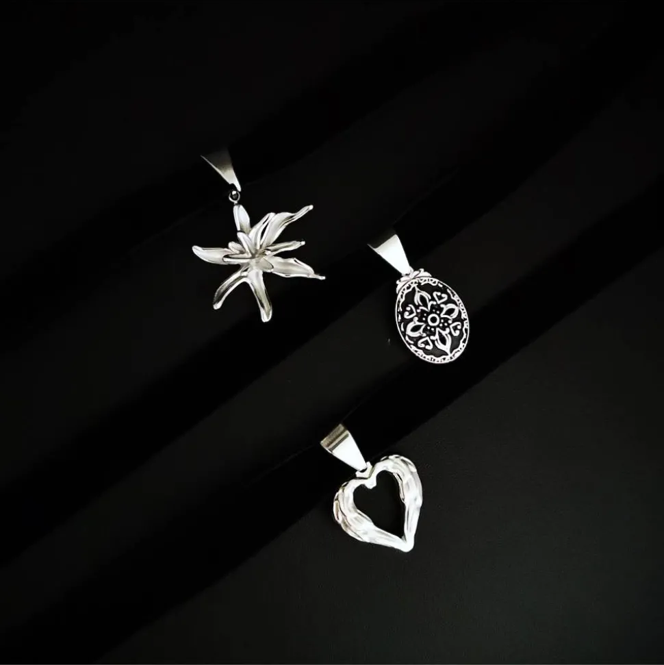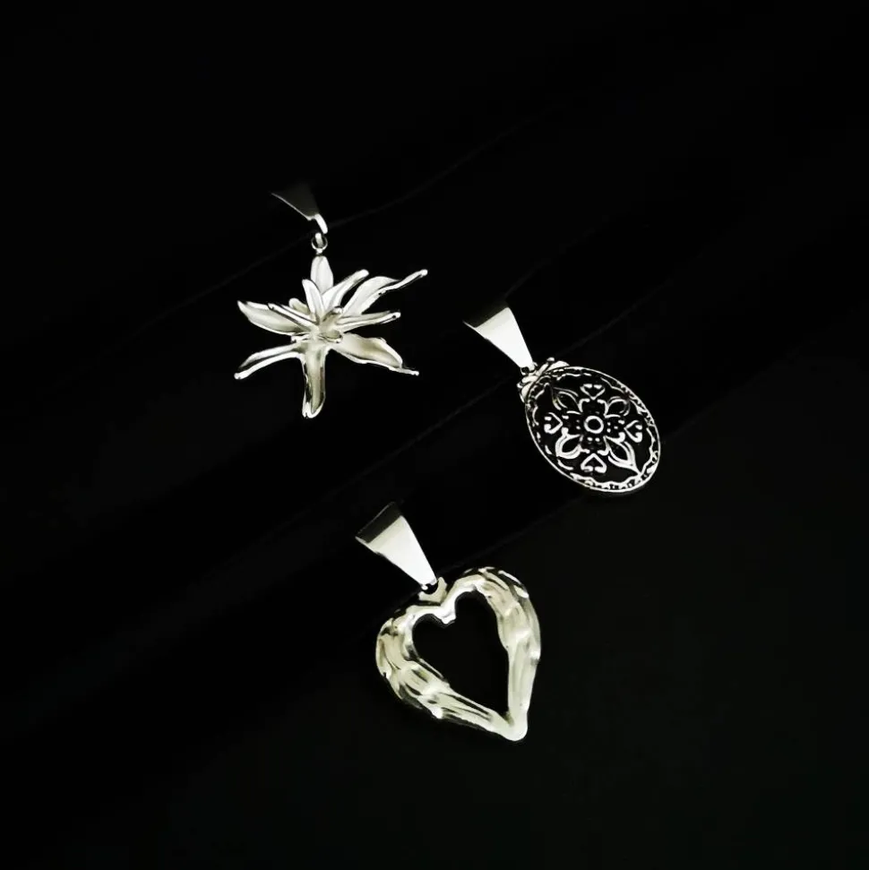 Die Kette ist aus hochwertigem Samtband gefertigt, während die Anhänger und Verschlüsse aus Edelstahl bestehen.