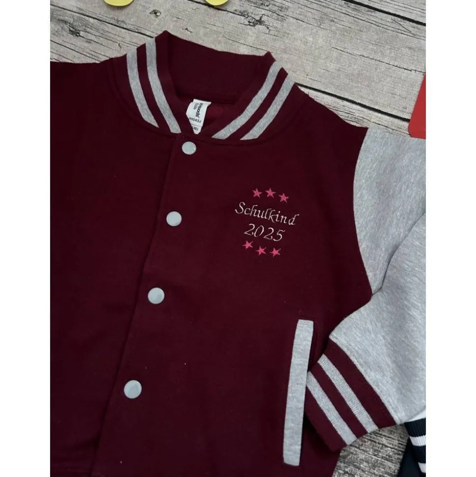 Auf der Vorderseite wird die Jacke nach Wunsch mit dem Anfangsbuchstaben des Kindes ODER einem der beiden Schulkind 2025 Motiven bestickt.