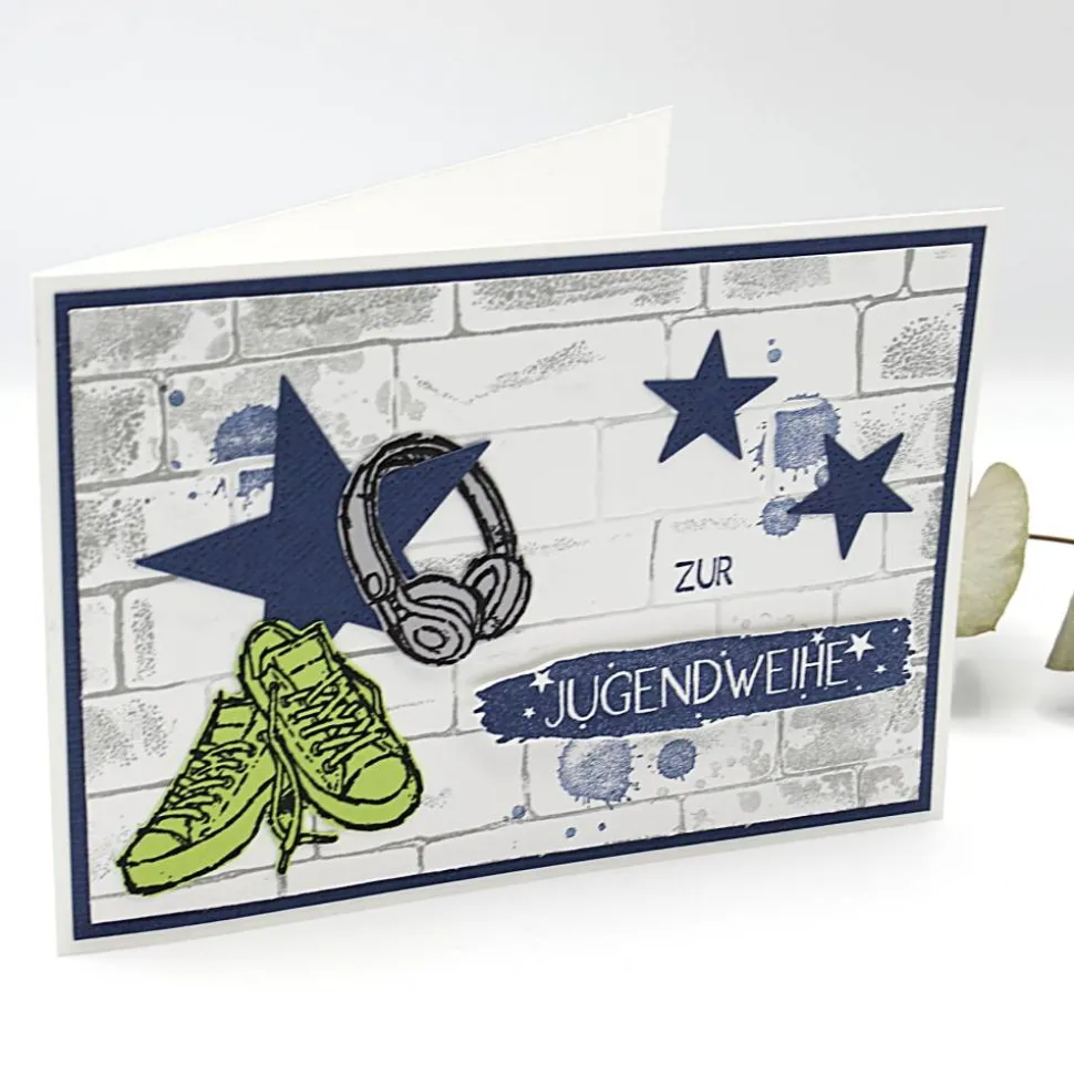 Den Schriftzug „Zur Jugendweihe“ habe ich gestempelt und mit Abstandspads auf der Karte befestigt.