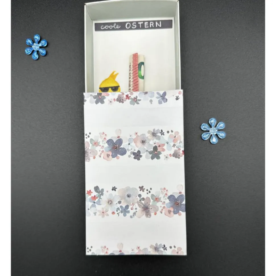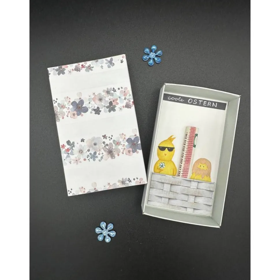 Im Innenteil der Schachtel sind zwei handgemalte Küken. Das linke Küken hat eine Sonnenbrille und hält eine hellblaue Blume, die aus einem Schmuckstein besteht. Das rechte Küken hat noch Schale auf dem Kopf. Beide sitzen in einem Korb. Dieser ist aus Motivpapier gefertigt. Als Überschrift steht in weißer Schrift auf schwarzem Grund: „coole OSTERN“.