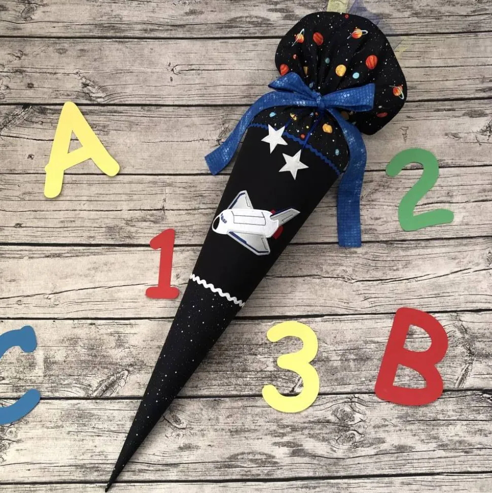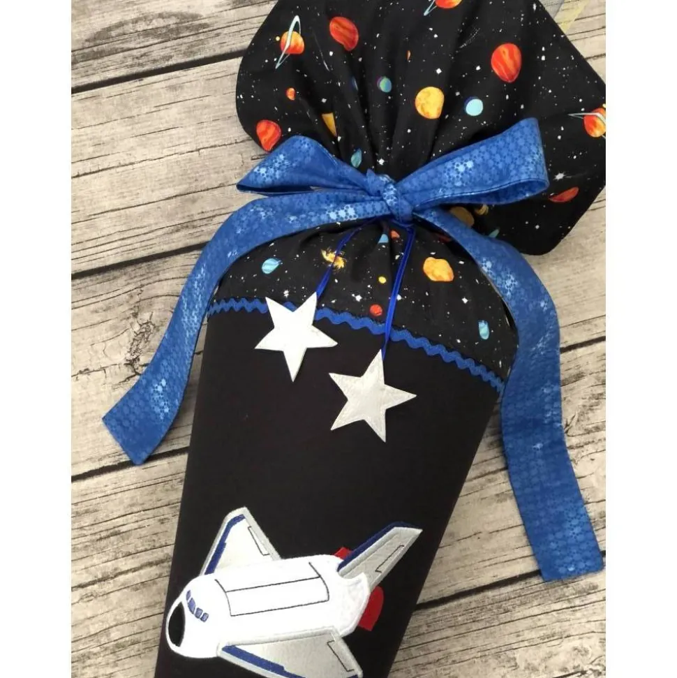 Hier habe ich eine ganz, ganz besondere Schultüte für euch. Genäht aus schönen Baumwollstoffen im Weltraum-Design in Kombi mit uni schwarz. In der Mitte wurde sie mit einem tollen Spaceshuttle von RockQueen bestickt. Kleine Details wie Tüll und Sternen-Anhänger machen sie zu einem echten Highlite.