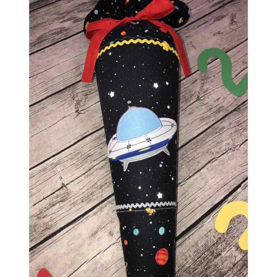 Hier habe ich eine ganz, ganz besondere Schultüte für euch. Genäht aus schönen Baumwollstoffen im Weltraum-Design in Kombi mit uni schwarz. In der Mitte wurde sie mit einem coolen UFO bestickt. Kleine Details wie reflektierende Sternchen und ein Stern-Knopf machen sie zu einem echten Hightlite.