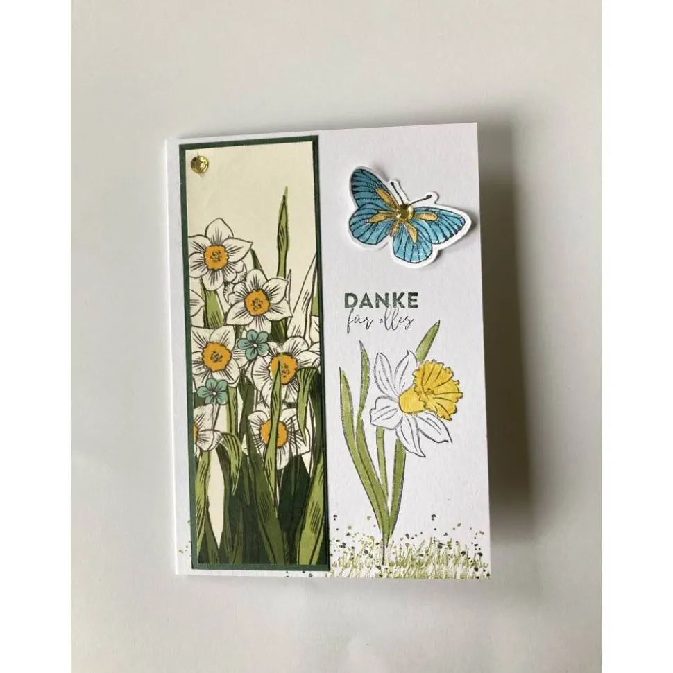 Diese Karte besteht aus einem Grundkarton in der Farbe „Grundweiß „. Aufleger Farbkarton Lodengrün & Designpapier Narzissenzeit.