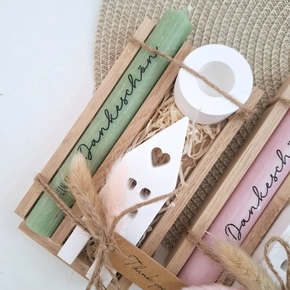 Das Geschenkset wird in einer Holzbox zusammengebunden, mit Trockenblumen (können variieren) verziert und mit einem Anhänger “ Thank you “ ergänzt.