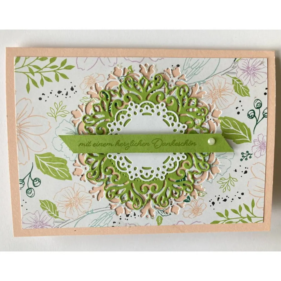 mit Stanzen, Designpapier“ Hübsche Grüße“, Farbkarton in Blütenrosa sowie ein Schmuckstein von Stampin’up!