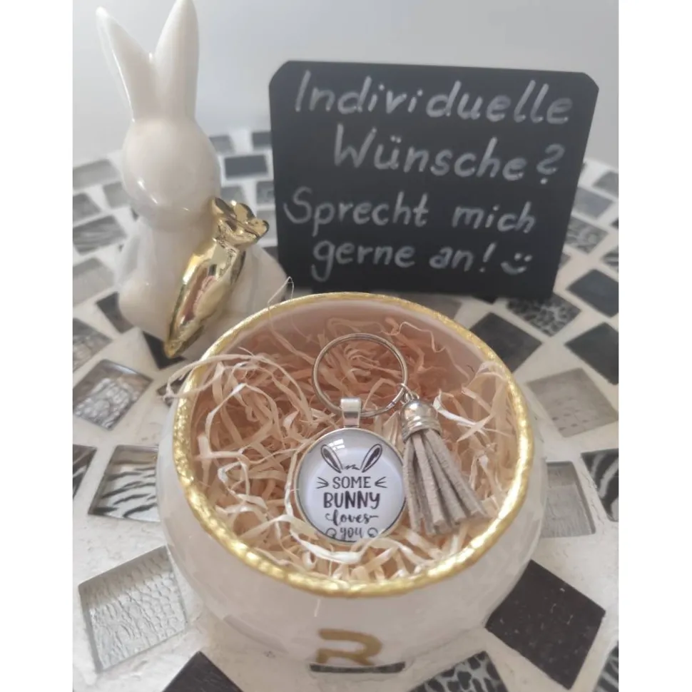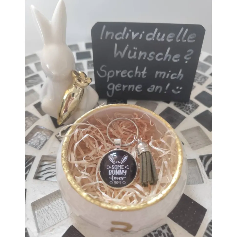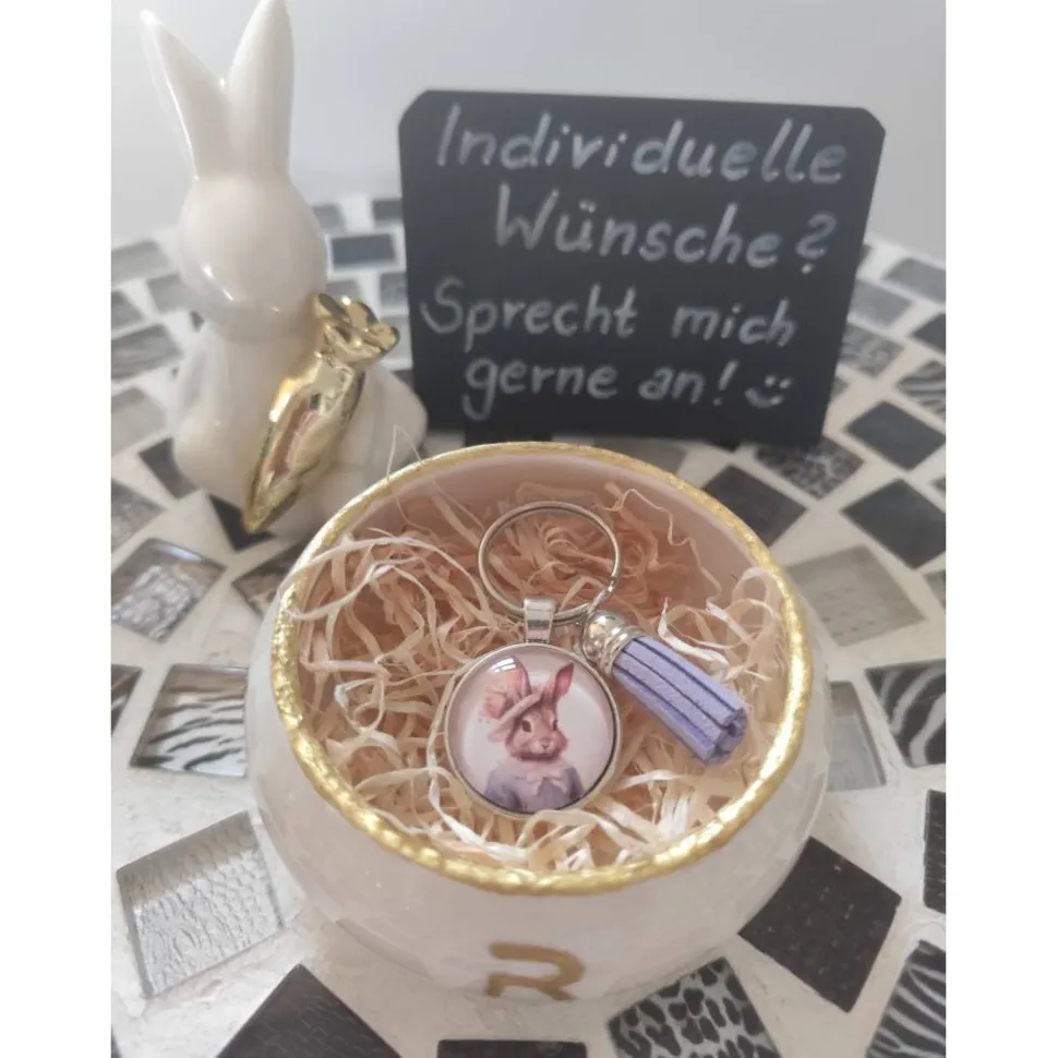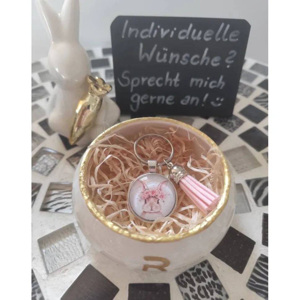 Ein handbemaltes Schmuckschälchen wird liebevoll mit Holzwolle gefüllt und enthält einen Glas-Cabochon Anhänger mit süßem Ostermotiv.