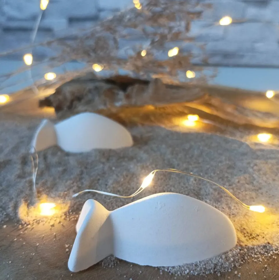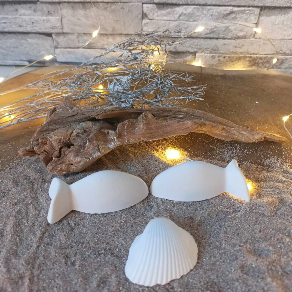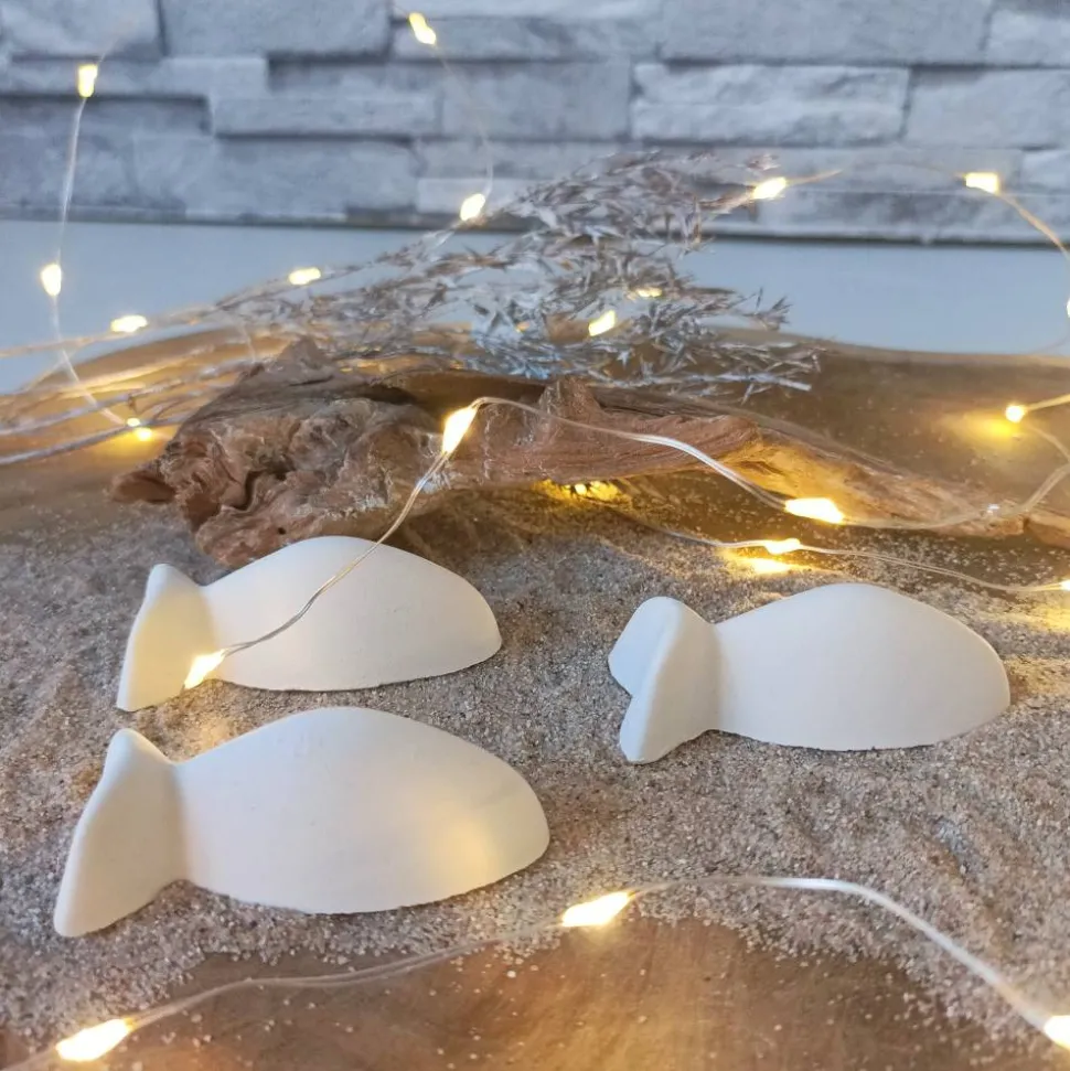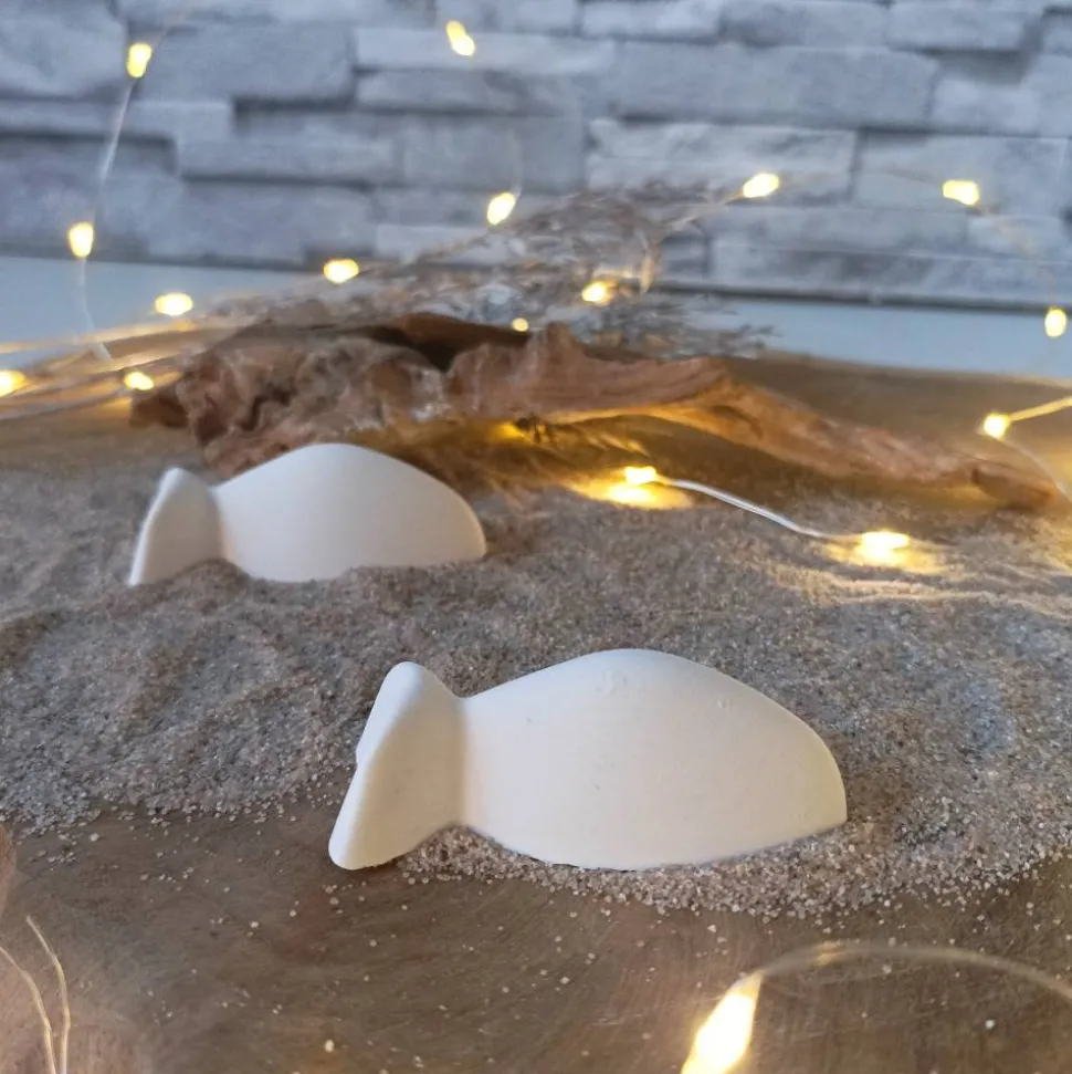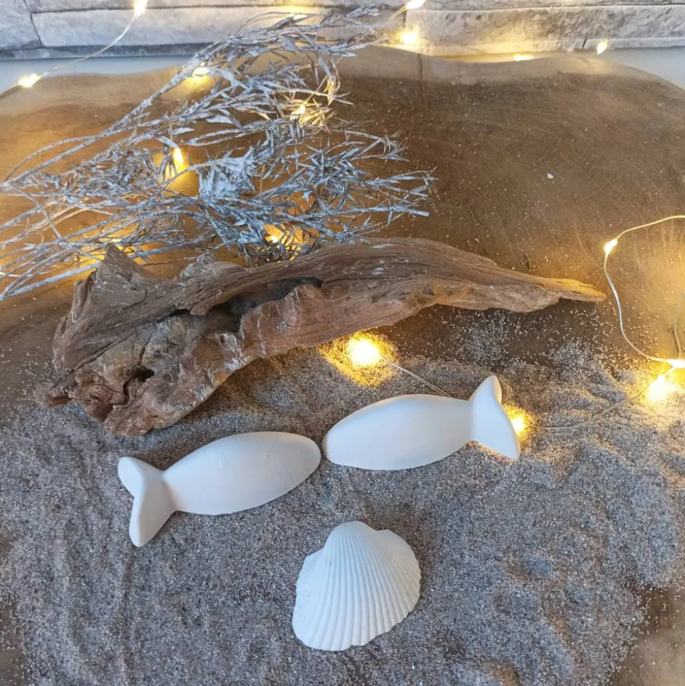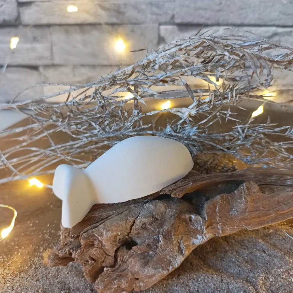 Raysin oder Keraflott, das feine, weiße Gießpulver auf Gipsbasis, wird mit viel Liebe zum Detail in handgefertigte Fische verwandelt. Leichte Unregelmäßigkeiten und Lufteinschlüsse sind charakteristisch für Raysin-Dekorationen und verleihen jedem Fisch seine Einzigartigkeit. Da jedes Produkt ein handgefertigtes Unikat ist, kann es leicht von den Produktfotos abweichen, was es zu einem besonderen Erlebnis macht.