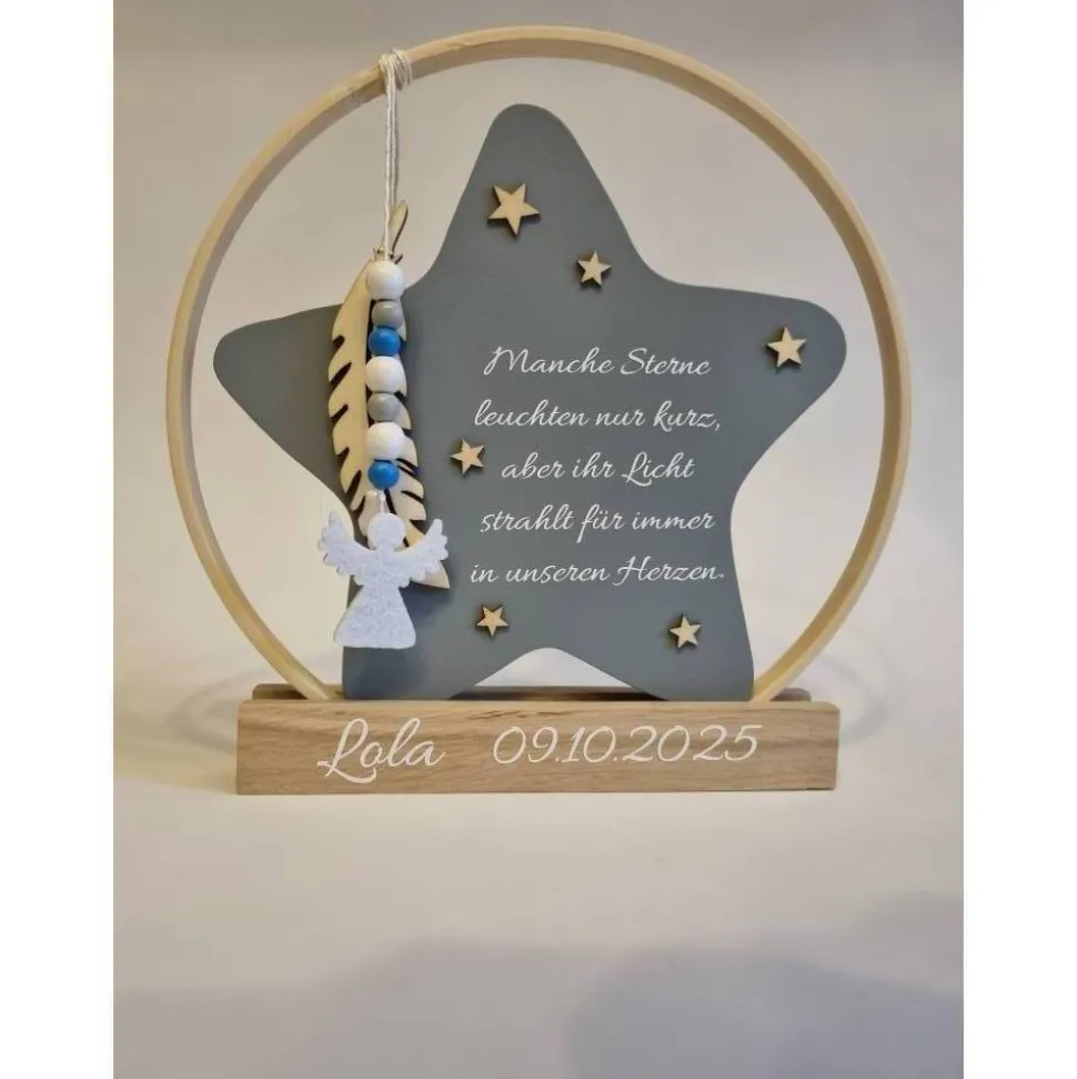 Er eignet sich wunderschön zum Aufstellen an einem besonderen Ort – vielleicht auf einem Regal, wo das Licht darauf fällt, oder an einem Ort, an dem er täglich ein kleines Lächeln schenkt. Der Holzstern kann für jeden, der ihn sieht, eine stille, aber berührende Erinnerung sein – etwas, das für immer Bestand hat und uns daran erinnert, dass diese kleine Seele zwar kurz bei uns war, aber große Spuren hinterlassen hat.