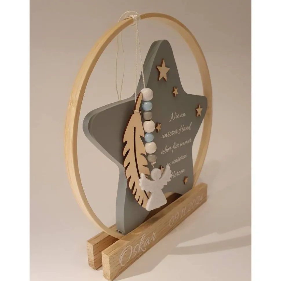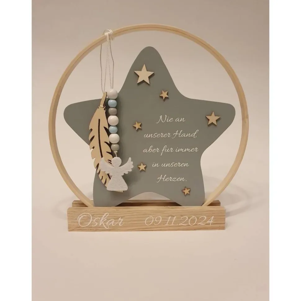 Er eignet sich wunderschön zum Aufstellen an einem besonderen Ort – vielleicht auf einem Regal, wo das Licht darauf fällt, oder an einem Ort, an dem er täglich ein kleines Lächeln schenkt. Der Holzstern kann für jeden, der ihn sieht, eine stille, aber berührende Erinnerung sein – etwas, das für immer Bestand hat und uns daran erinnert, dass diese kleine Seele zwar kurz bei uns war, aber große Spuren hinterlassen hat.