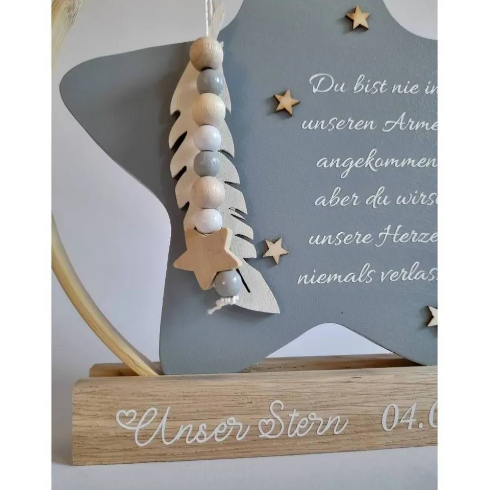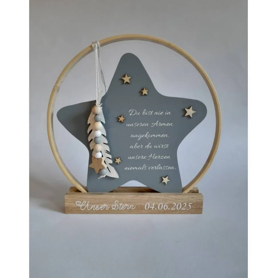 Er eignet sich wunderschön zum Aufstellen an einem besonderen Ort – vielleicht auf einem Regal, wo das Licht darauf fällt, oder an einem Ort, an dem er täglich ein kleines Lächeln schenkt. Der Holzstern kann für jeden, der ihn sieht, eine stille, aber berührende Erinnerung sein – etwas, das für immer Bestand hat und uns daran erinnert, dass diese kleine Seele zwar kurz bei uns war, aber große Spuren hinterlassen hat.