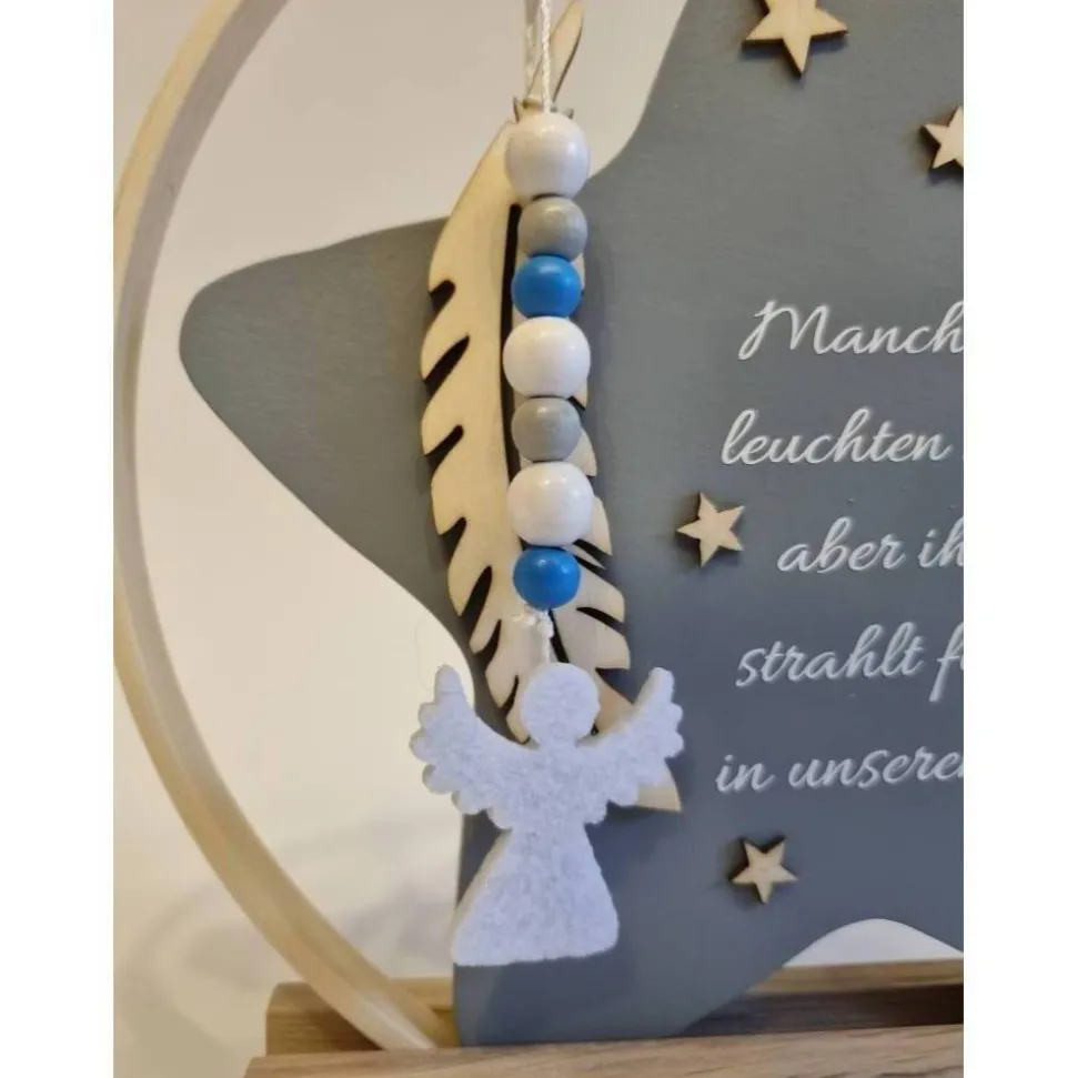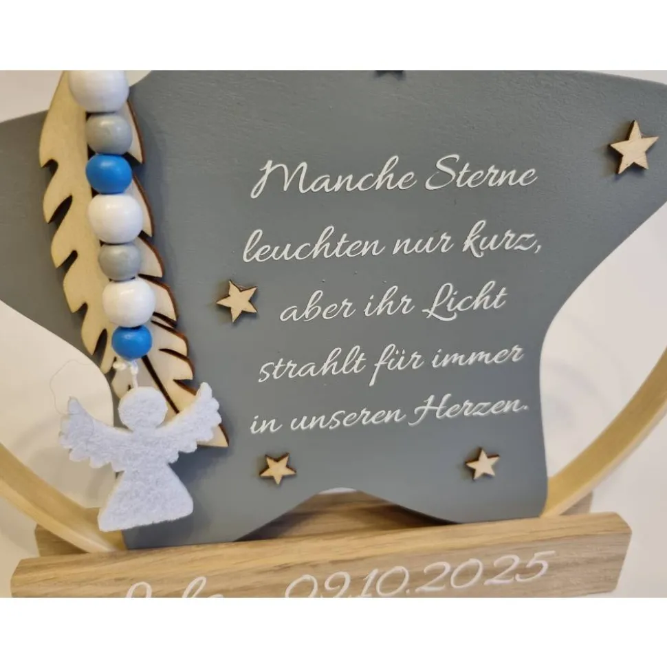 Er eignet sich wunderschön zum Aufstellen an einem besonderen Ort – vielleicht auf einem Regal, wo das Licht darauf fällt, oder an einem Ort, an dem er täglich ein kleines Lächeln schenkt. Der Holzstern kann für jeden, der ihn sieht, eine stille, aber berührende Erinnerung sein – etwas, das für immer Bestand hat und uns daran erinnert, dass diese kleine Seele zwar kurz bei uns war, aber große Spuren hinterlassen hat.