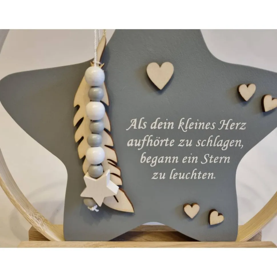 Er eignet sich wunderschön zum Aufstellen an einem besonderen Ort – vielleicht auf einem Regal, wo das Licht darauf fällt, oder an einem Ort, an dem er täglich ein kleines Lächeln schenkt. Der Holzstern kann für jeden, der ihn sieht, eine stille, aber berührende Erinnerung sein – etwas, das für immer Bestand hat und uns daran erinnert, dass diese kleine Seele zwar kurz bei uns war, aber große Spuren hinterlassen hat.