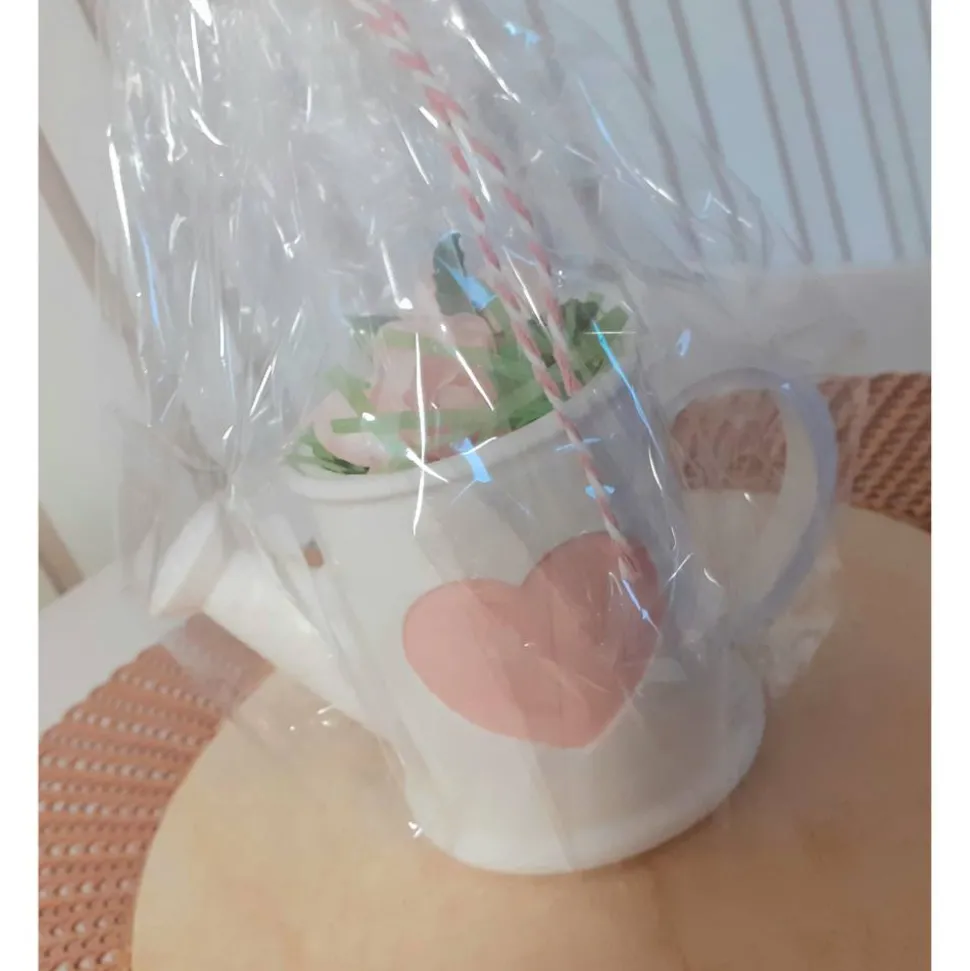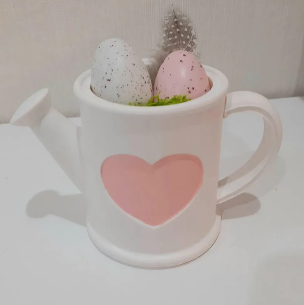 Die Gießkanne kann ich jeder gewünschten Farbe erworben werden. Hier zu sehen ist sie in der Farbe “ Weiß “ mit rosafarbenen Herzen.