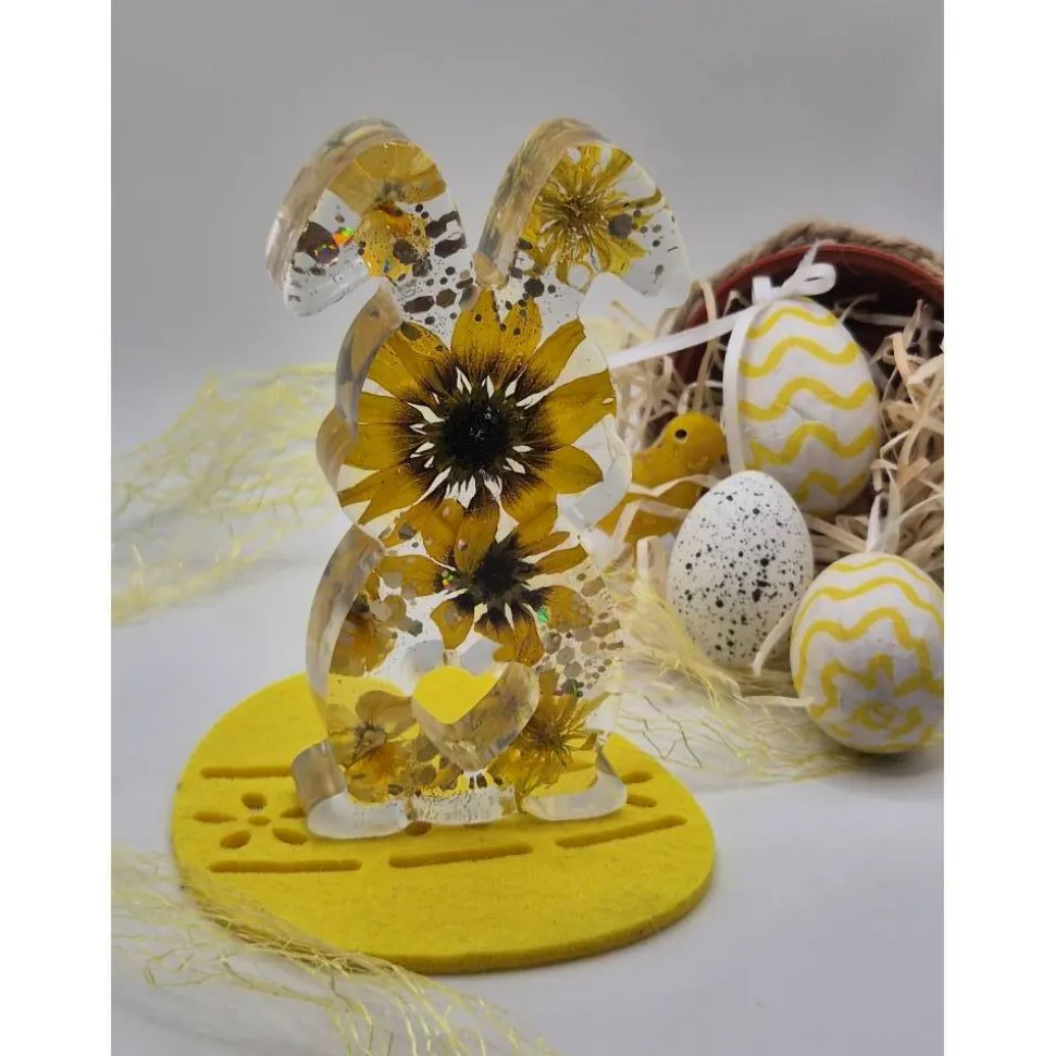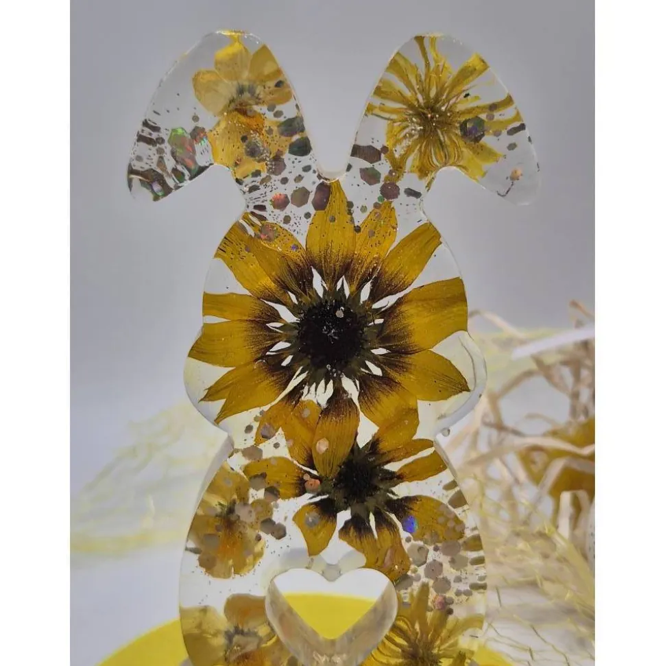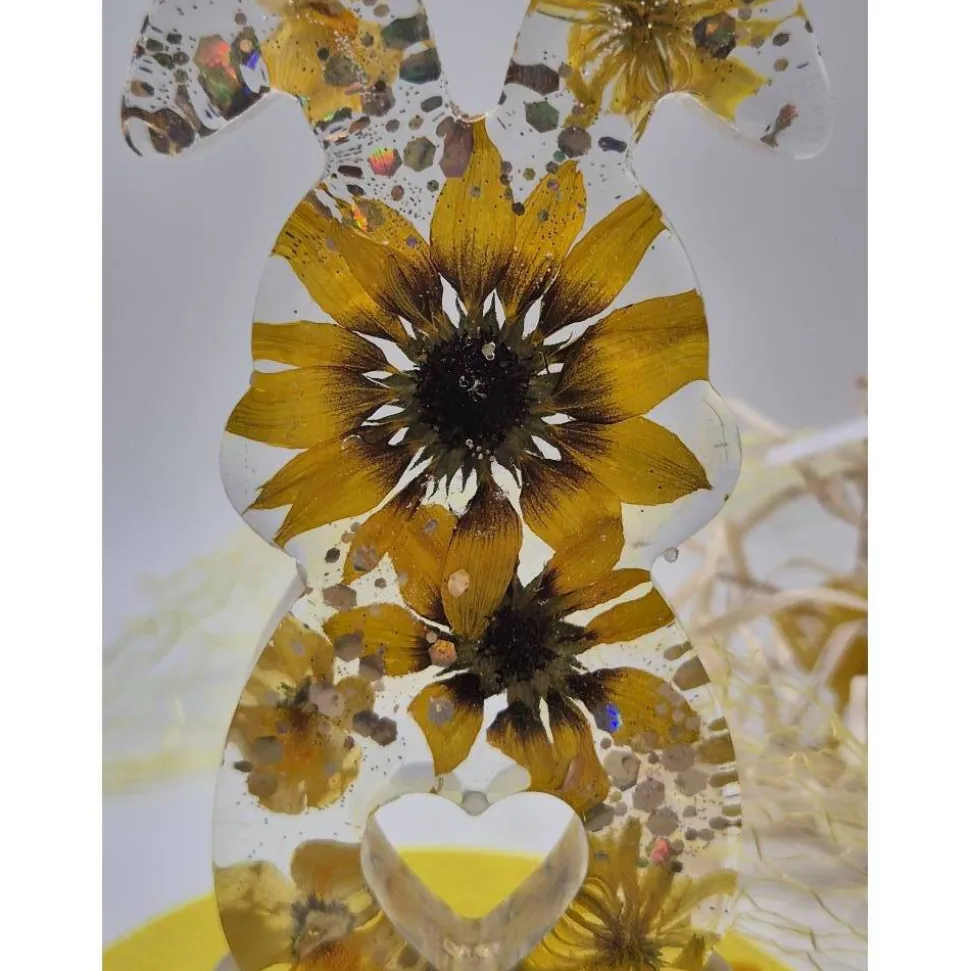 Dieser liebevoll gefertigte Hase ist ein ganz besonderer Blickfang für deine Frühlings- und Osterdekoration. In aufwendiger Handarbeit aus klarem Epoxidharz gegossen mit echten, sorgfältig getrockneten Blumen in gelb veredelt und funkelnden Glitzer Akzenten ist jedes Stück ein echtes Unikat – kein Hase gleicht dem anderen.