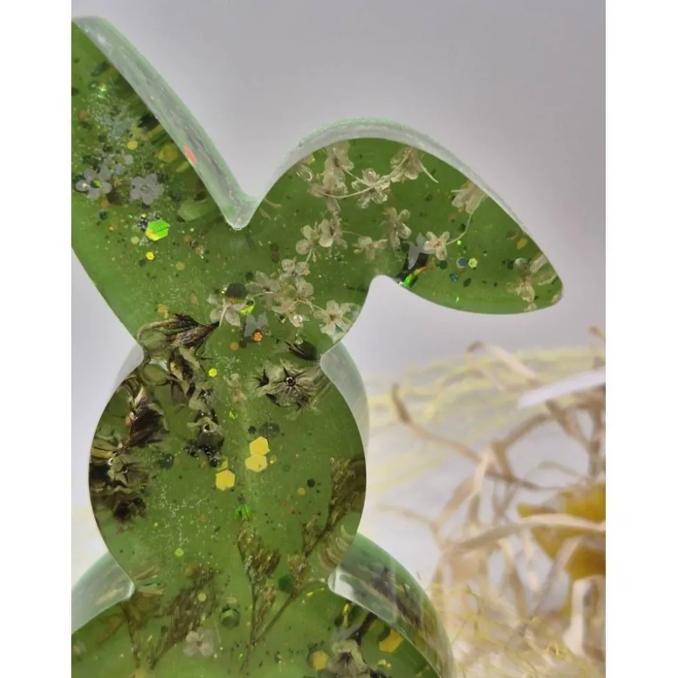 Dieser liebevoll gefertigte Hase ist ein ganz besonderer Blickfang für deine Frühlings- und Osterdekoration. In aufwendiger Handarbeit aus klarem Epoxidharz gegossen mit echten, sorgfältig getrockneten Blumen in Beige und grün veredelt und funkelnden Glitzer Akzenten ist jedes Stück ein echtes Unikat – kein Hase gleicht dem anderen.