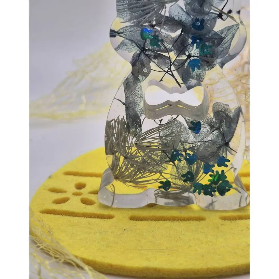 Die eingebetteten Blüten wirken, als würden sie im Hasen schweben, und verleihen ihm eine zarte, natürliche Leichtigkeit. Durch das transparente Harz kommen die Farben der Blüten wunderschön zur Geltung und machen den Hasen zu einem kleinen Kunstwerk.