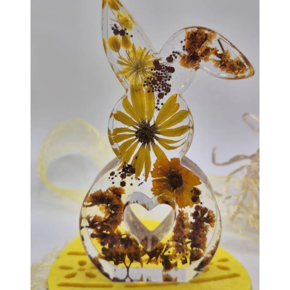 Die eingebetteten Blüten wirken, als würden sie im Hasen schweben, und verleihen ihm eine zarte, natürliche Leichtigkeit. Durch das transparente Harz kommen die Farben der Blüten wunderschön zur Geltung und machen den Hasen zu einem kleinen Kunstwerk.