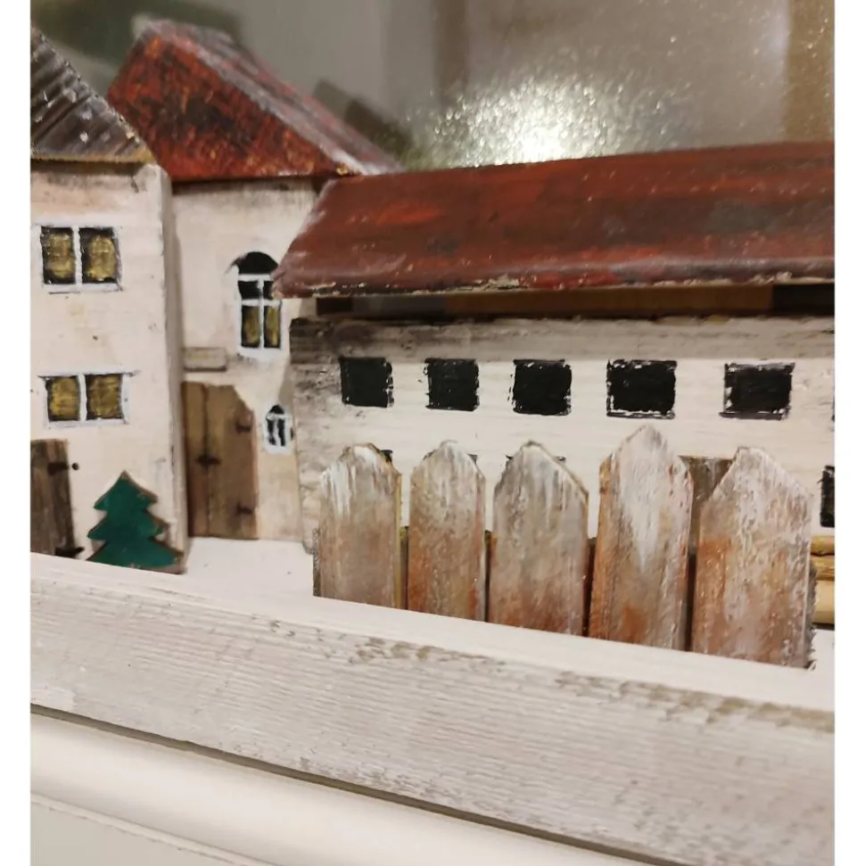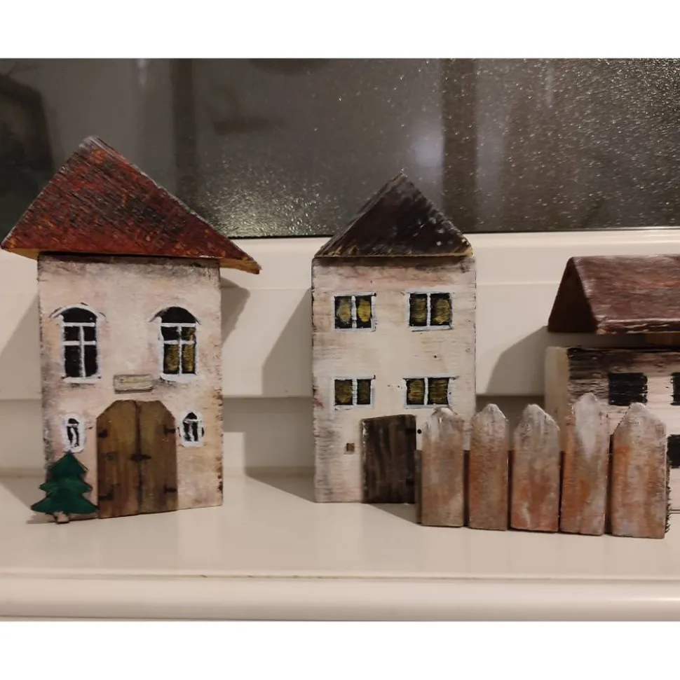 die Häuschen sind gesägt, geleimt und handbemalt, die Türen und Bäume habe ich aus Holz angefertigt und angeleimt