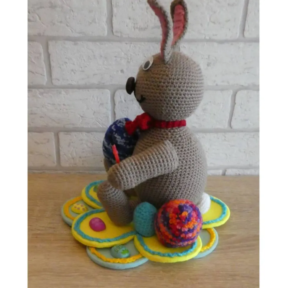 Der Hase sitzt auf einem Untersetzer aus Filzblumen, der Hase ist abnehmbar. Der Untersetzter wurde mit Ostereiern (Holz und umäkelte Styroporeier) dekoriert. Außerdem hat der Hase einen Pinsel in der Pfote.
