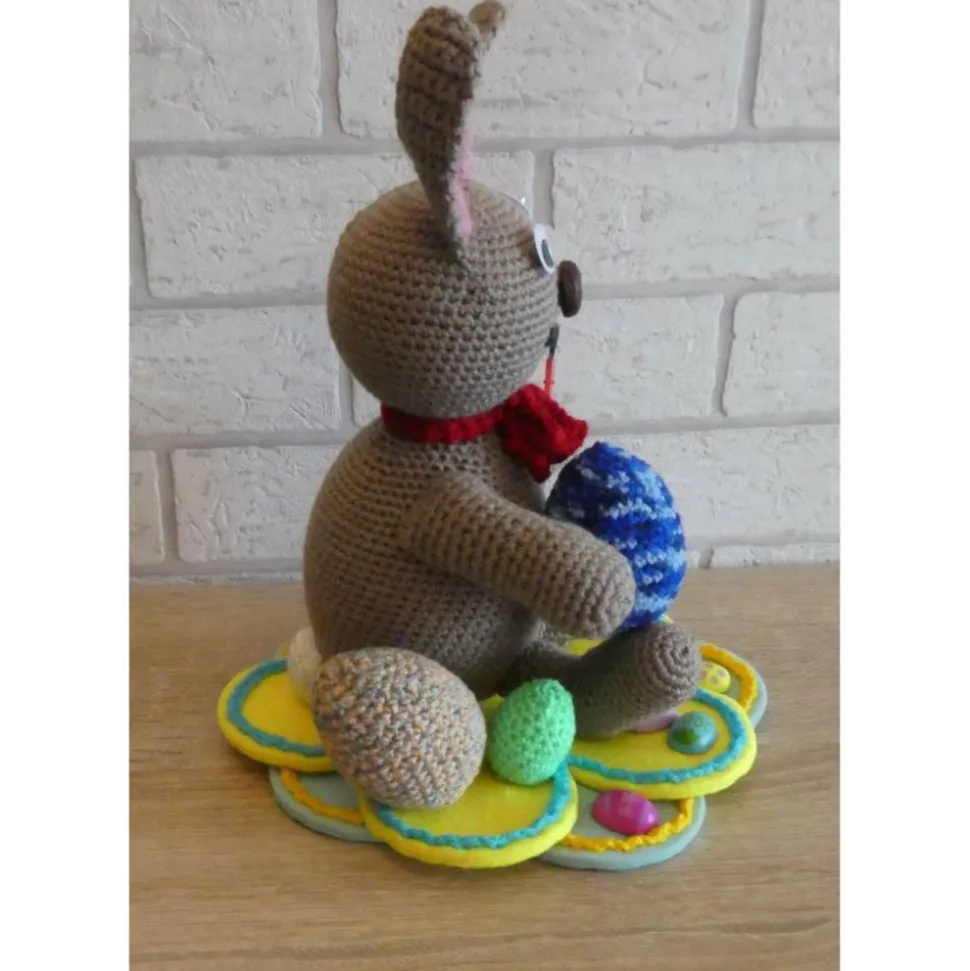 Der Hase besteht aus einem umhäkelten Styroporei und einer umhäkelten Styroporkugel. Er hat Kulleraugen und einen Knopf als Nase.