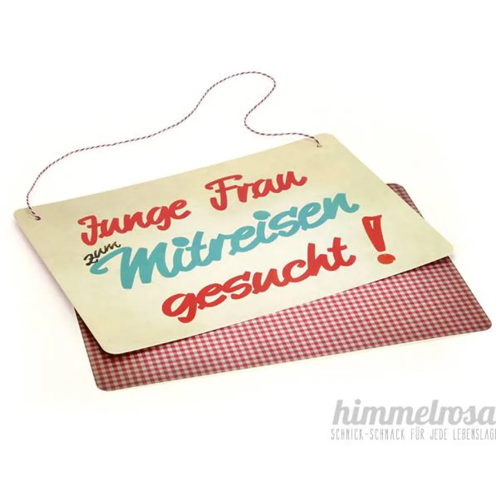 …wie früher auf der Kirmes, nur diesmal wird eine Frau zum Mitreisen gesucht – dieses authentische Schild passt zu vielen Gelegenheiten. Es ist im Vintage-Stil gestaltet, sieht also aus, als würde es schon Jahre hängen. Die „junger Mann“ Variante ist auch im Shop verfügbar.