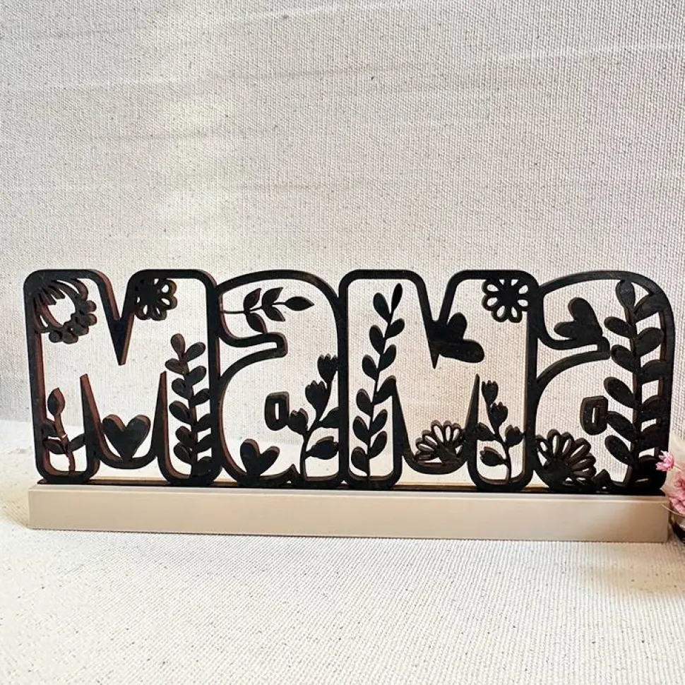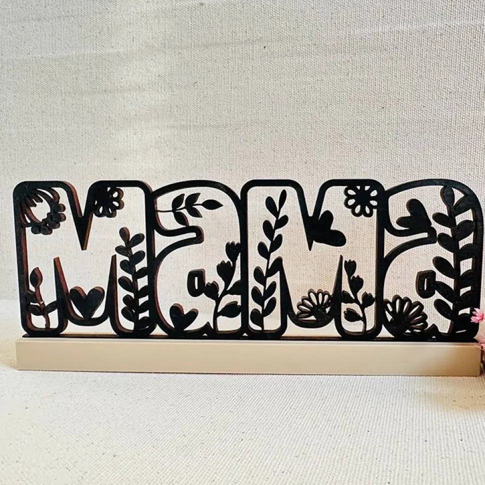 Der Schriftzug ist zweitilig und besteht aus einer harmonischen Kombination aus schwarzem Holz und einem Aufsteller aus umweltfreundichen PLA.