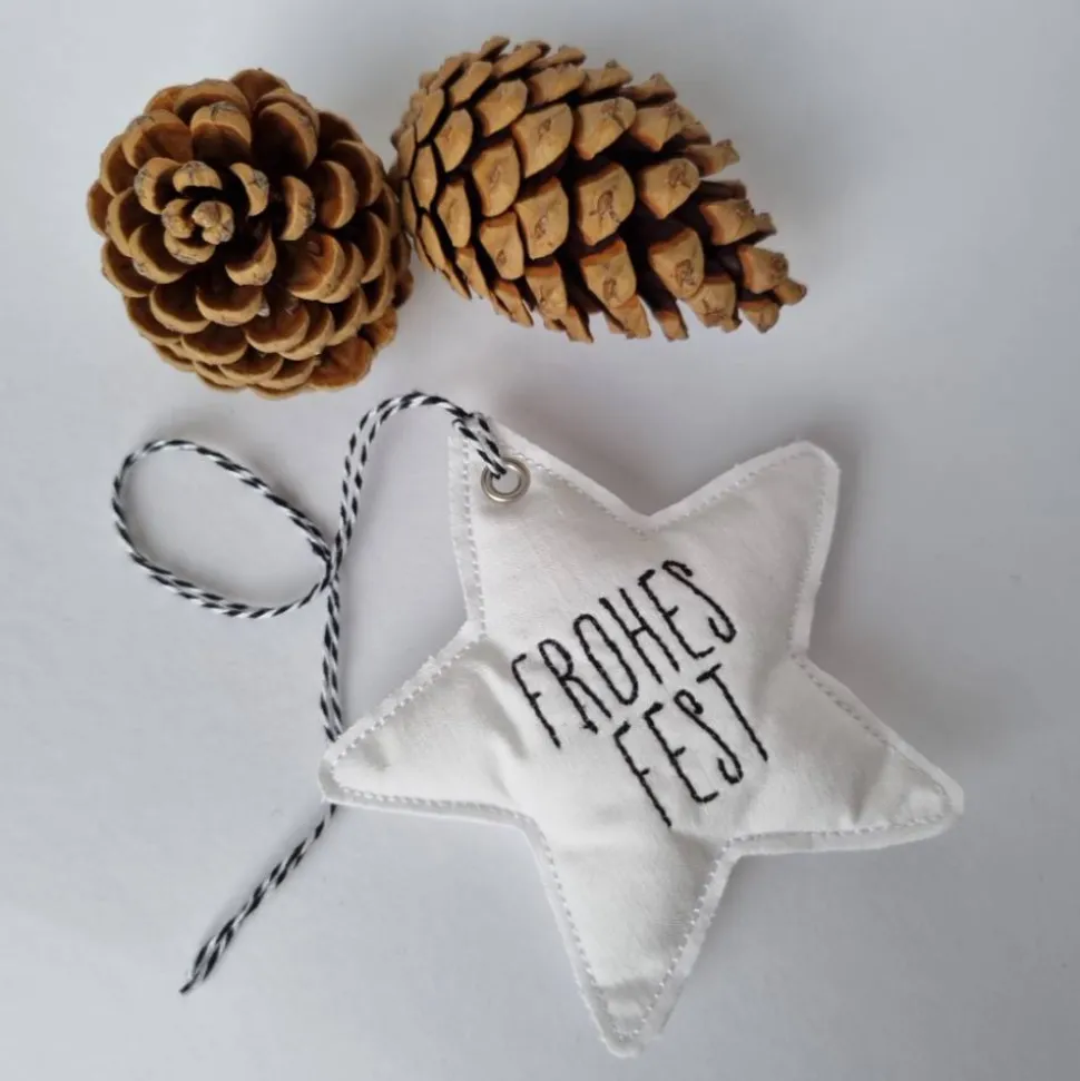 Der Deko-Stern ist mit einer Stickmaschine erstellt (ITH), mit Füllwatte ausgestopft und im Anschluss einfach ausgeschnitten worden. Deshalb kann er im Laufe der Zeit etwas ausfransen, was den Vintage-Charakter noch weiter unterstreicht und keinen Mangel darstellt. Ein gewollter Patina-Look entsteht.