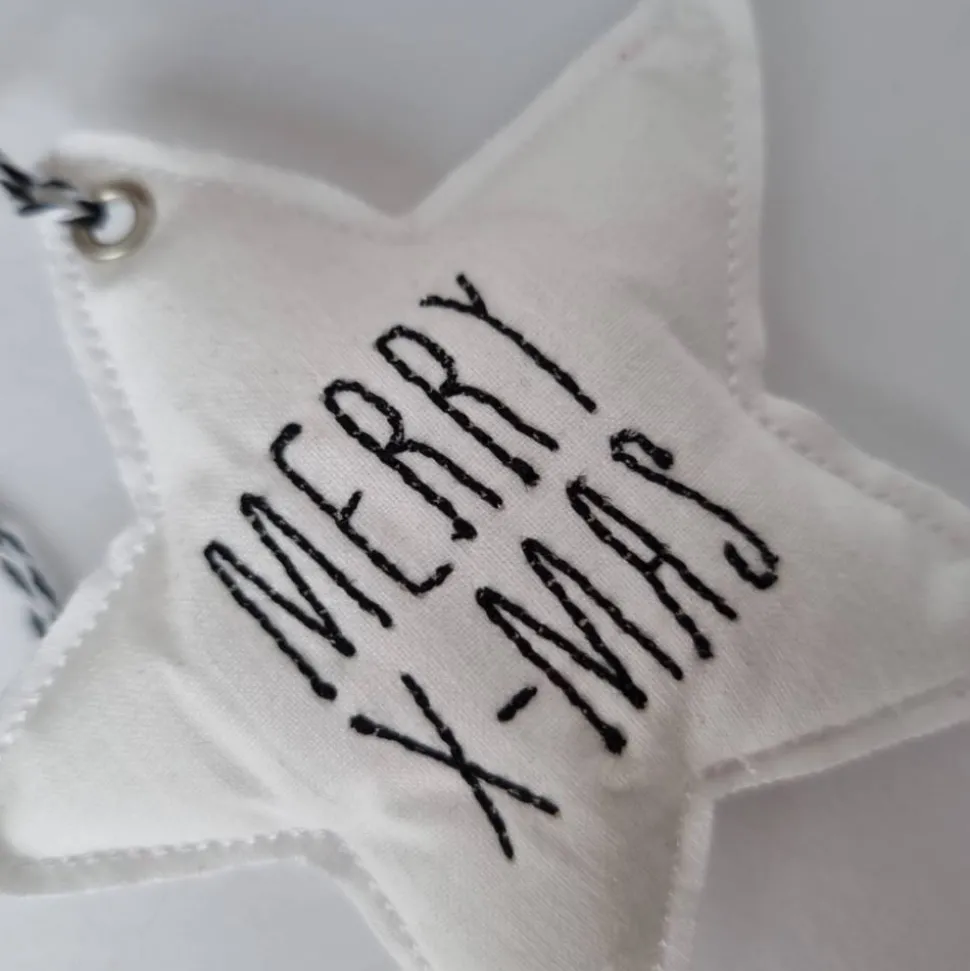 Der Stern wurden aus einem Vintage-Baumwollstoff aus den 60er Jahren hergestellt, der in seinem Vorleben Teil einer Aussteuer-Bettwäsche war. Er wurde selbstverständlich gewaschen und auf Löcher und Verschmutzung hin kontrolliert. Der Stoff ist in der sog. Linon-Webart gemacht worden und weist dadurch eine leicht grobe Struktur auf, die an Leinen erinnert und die gut zu den klaren schwarzen Buchstaben passt.