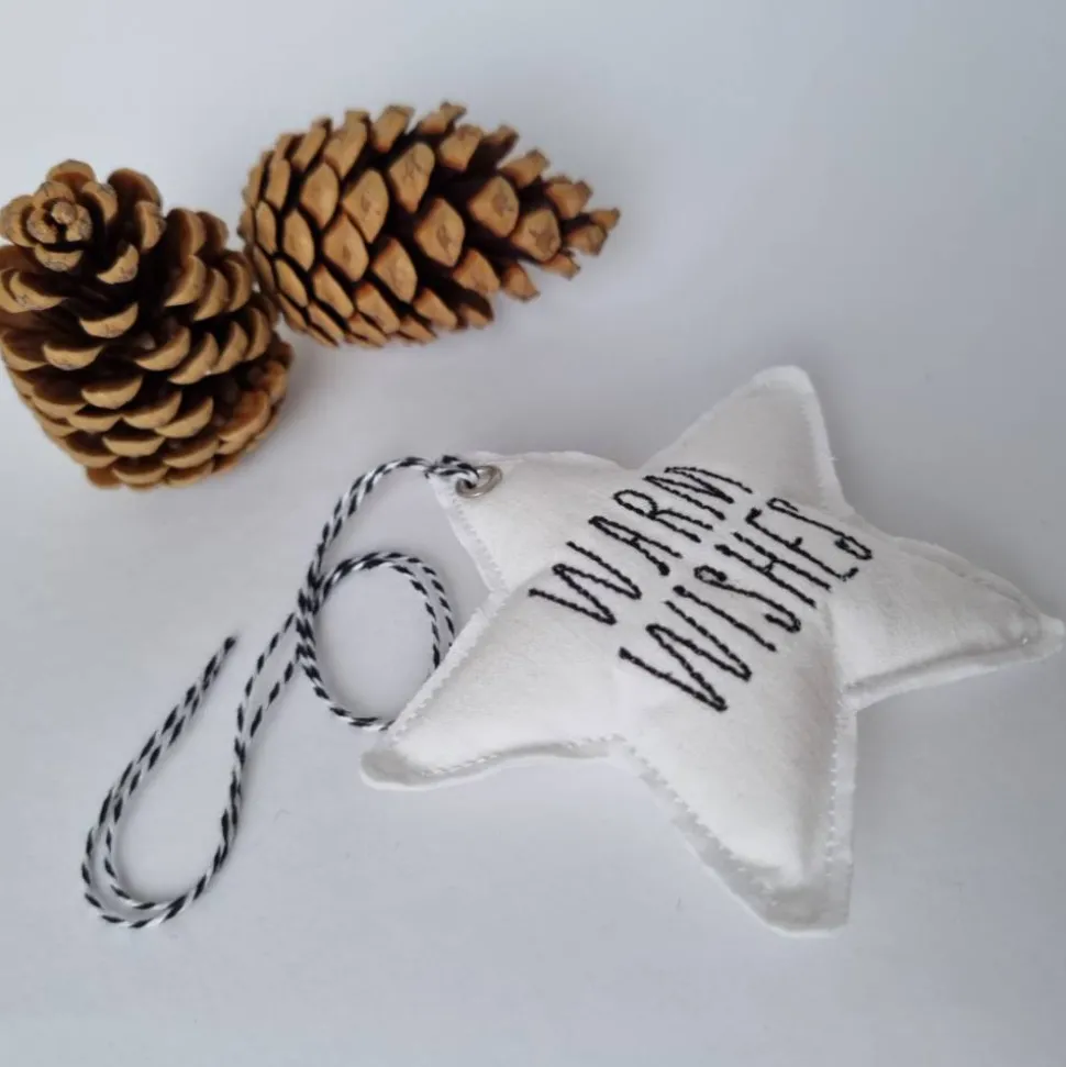 Der Deko-Stern ist mit einer Stickmaschine erstellt (ITH), mit Füllwatte ausgestopft und im Anschluss einfach ausgeschnitten worden. Deshalb kann er im Laufe der Zeit etwas ausfransen, was den Vintage-Charakter noch weiter unterstreicht und keinen Mangel darstellt. Ein gewollter Patina-Look entsteht.