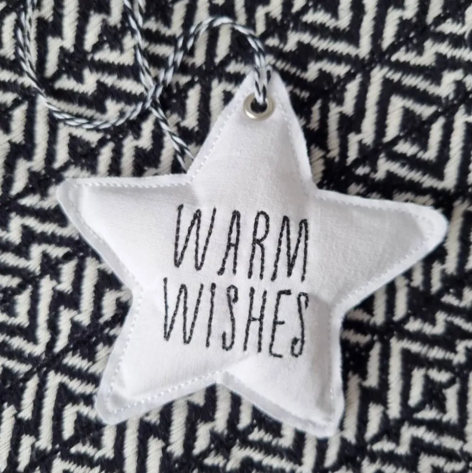 Der Stern wurden aus einem Vintage-Baumwollstoff aus den 60er Jahren hergestellt, der in seinem Vorleben Teil einer Aussteuer-Bettwäsche war. Er wurde selbstverständlich gewaschen und auf Löcher und Verschmutzung hin kontrolliert. Der Stoff ist in der sog. Linon-Webart gemacht worden und weist dadurch eine leicht grobe Struktur auf, die an Leinen erinnert und die gut zu den klaren schwarzen Buchstaben passt.