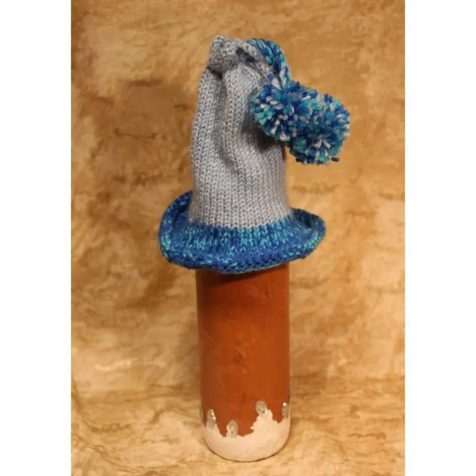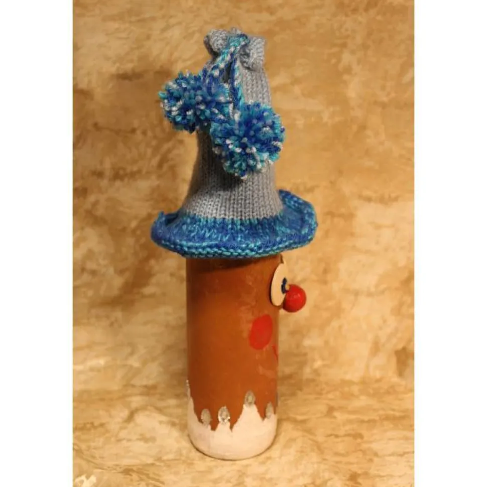 Weihnachtswichtel aus einer Glasflasche. Witziges Upcycling-Projekt, gestaltet mit Acrylfarbe in unterschiedlichen Beige- und Brauntönen, etwas scheckig bemalt. Der Wichtel hat ein Näschen aus Ton und ist mit einem handgestrickten Wollmützchen dekoriert. Die Mütze ist mit zwei kleinen Bommeln geschmückt. Der untere Rand ist in weiß bemalt und mit glitzernden Dekosteinen beklebt.