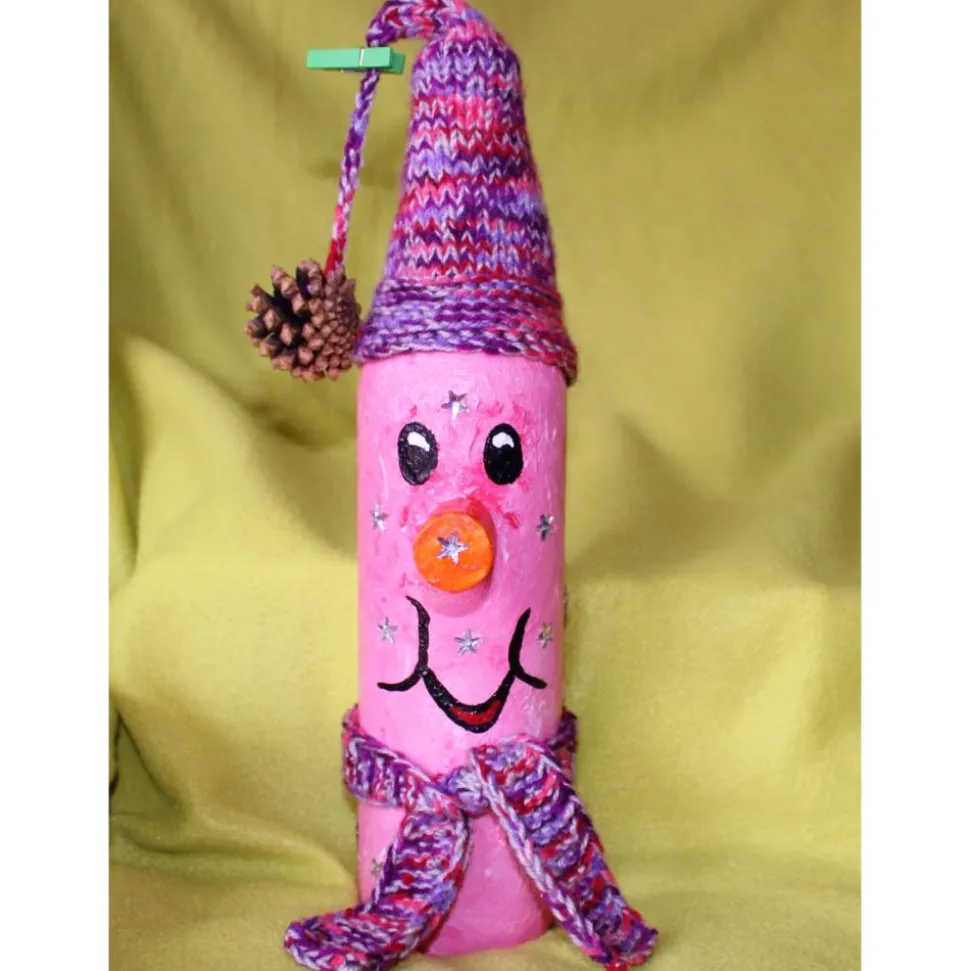 Schneemann aus einer Glasflasche. Witziges Upcycling-Projekt, gestaltet mit Acrylfarbe und einem handgestrickten Wollmützchen. Verziert mit handgestricktem Schal, Glitzersteinen, Zapfen und einer Holzklammer. Kann als Geldgeschenk verwendet werden indem man einen Geldschein an die Klammer zwickt oder seitlich in den Schal ein paar Scheine klemmt :).