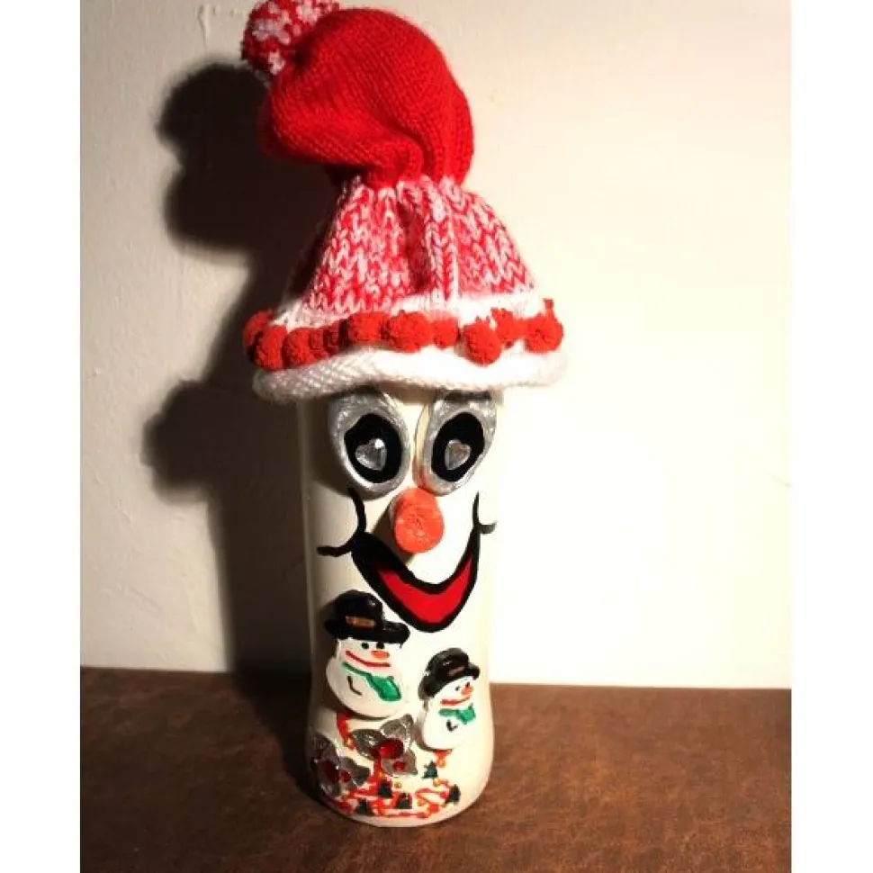 Weihnachtswichtel aus einer Weinflasche. Witziges Upcycling-Projekt, gestaltet mit Acrylfarbe und einem handgestrickten Wollmützchen. Verziert mit Schneemännern aus Ton und dekoriert mit Glitzersteinchen. Lustige Dekofigur für die Herbst- und Weihnachtszeit. Die Figur kann auch als Geldgeschenk verwendet werden indem man mit einer Klammer einen Geldschein oder Gutschein an der Mütze festklemmt.