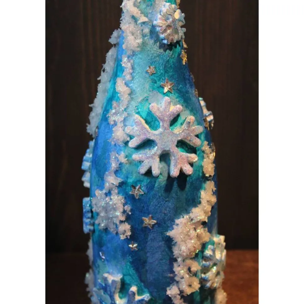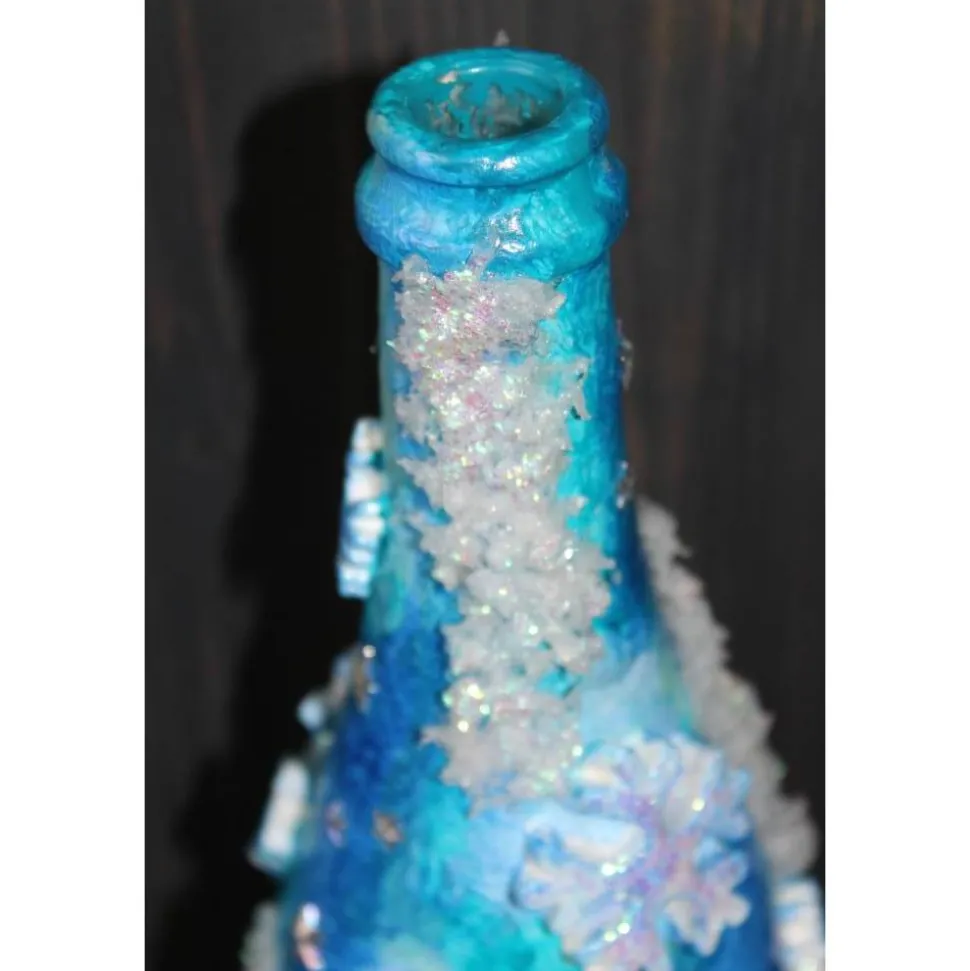 Winterliche Acrylmalerei/Collage auf einer Glasflasche, in Weiß und Blau gehalten. Witziges Upcycling-Projekt, künstlerisch gestaltet mit Modelliermasse, Kunststoffapplikationen, Glitzersteinen und Hologrammglitter. Wunderschöne, strahlende und glitzernde Effekte.